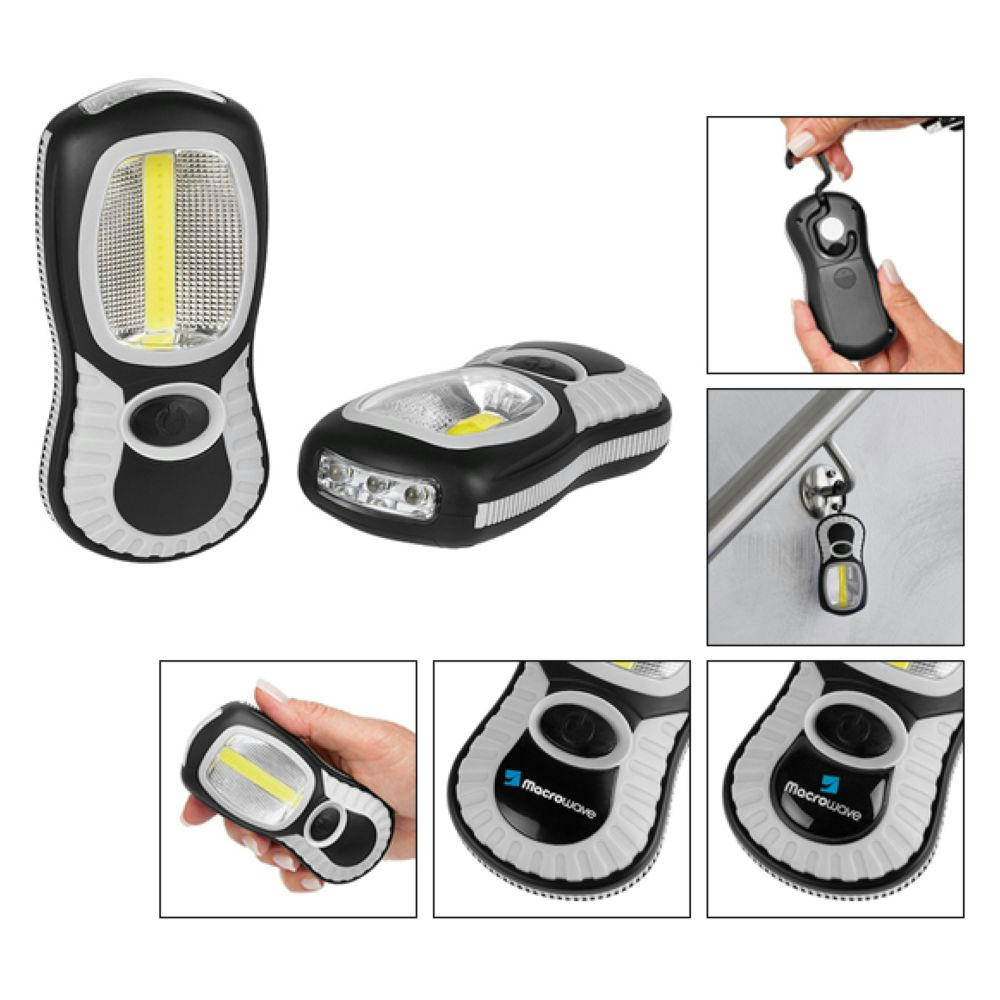 Arbeitsleuchte mit 3W COB LE D und 3 DIP LE D. Lichtwerte: Arbeitsleuchte 230 Lumen, Taschenleuchte 30 Lumen. Leuchtdauer: ca. 20 Std. Leuchtmodi: 100% Power weißes Licht. Starker vernickelter Magnet, 360° drehbarer Fixierhaken. Inkl. 3 AAA Batterien. In schwarzer Geschenkverpackung.