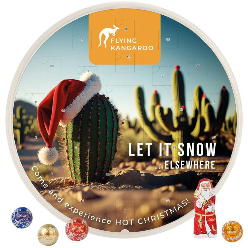 Runder Adventskalender mit Deckblatt mit kompostierbarem Innenteil, individuell bedruckt. Tiefziehteil in Créme-Weiß mit ausklappbarem Tischaufsteller und Aufhänger im Rücken integriert. Inhalt: 23 LINDOR Mini Kugeln der Marke LINDT, bunt gemischt. Hinter dem 24. Türchen verbirgt sich ein 10 g LINDT Weihnachtsmann, 113 g