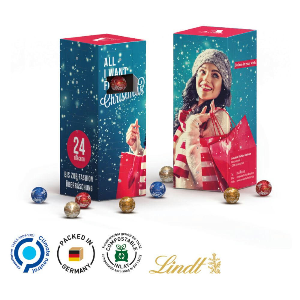Adventskalenderturm mit kompostierbarem Innenteil, rundum individuell bedruckt mit 5 Werbeflächen. Inhalt: 24 LINDOR Mini Kugeln der Marke LINDT, bunt gemischt, 109 g.