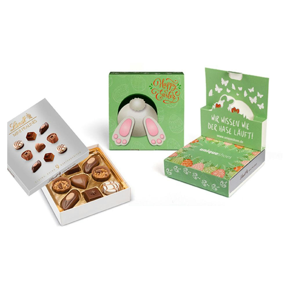 9 köstliche LINDT Mini Pralinés in individuell bedruckter Pop-Up Werbekartonage zum Aufklappen mit Ostermotiv.