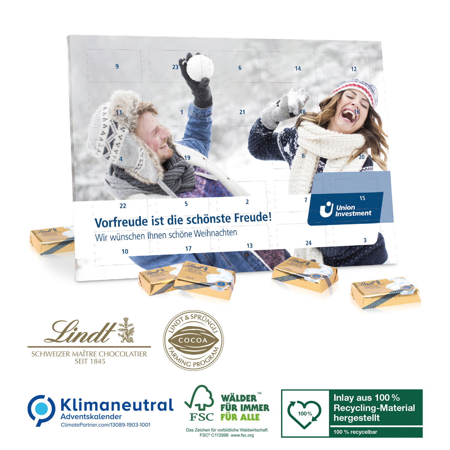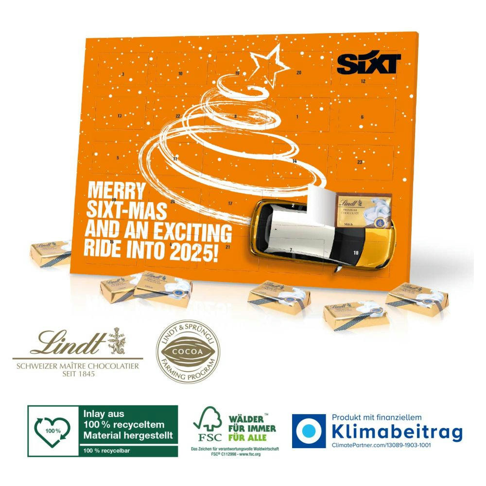Adventskalender in Vollkartonhülle, Querformat, mit Tischaufsteller zum Ausklappen. 24 Stück (ca. 120 g) Markenschokolade von LINDT. In Klarsichtverpackung. Produkt mit finanziellem Klimabeitrag. Preis inkl. 4c-Druck.