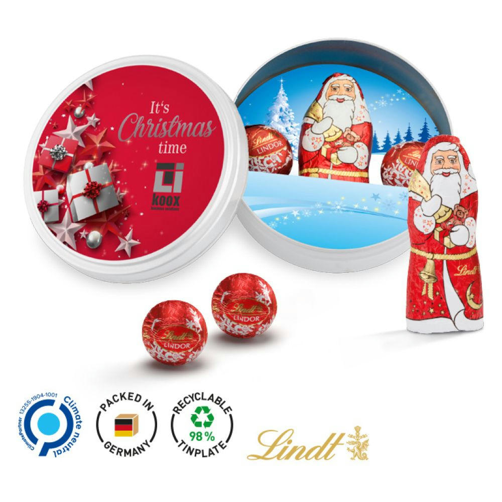 Dose mit Stülpdeckel, weiß aus Metall, individuell bedruckt. Mit weihnachtlich gestaltetem Display Einleger. Weißblech 98 % recycelbar. Inhalt: LINDT Schoko-Weihnachtsmann aus feiner Alpenvollmilchschokolade, 10 g, und 2 LINDT LINDOR Mini Milchkugeln á 4,5 g Saisonartikel - solange der Vorrat reicht!