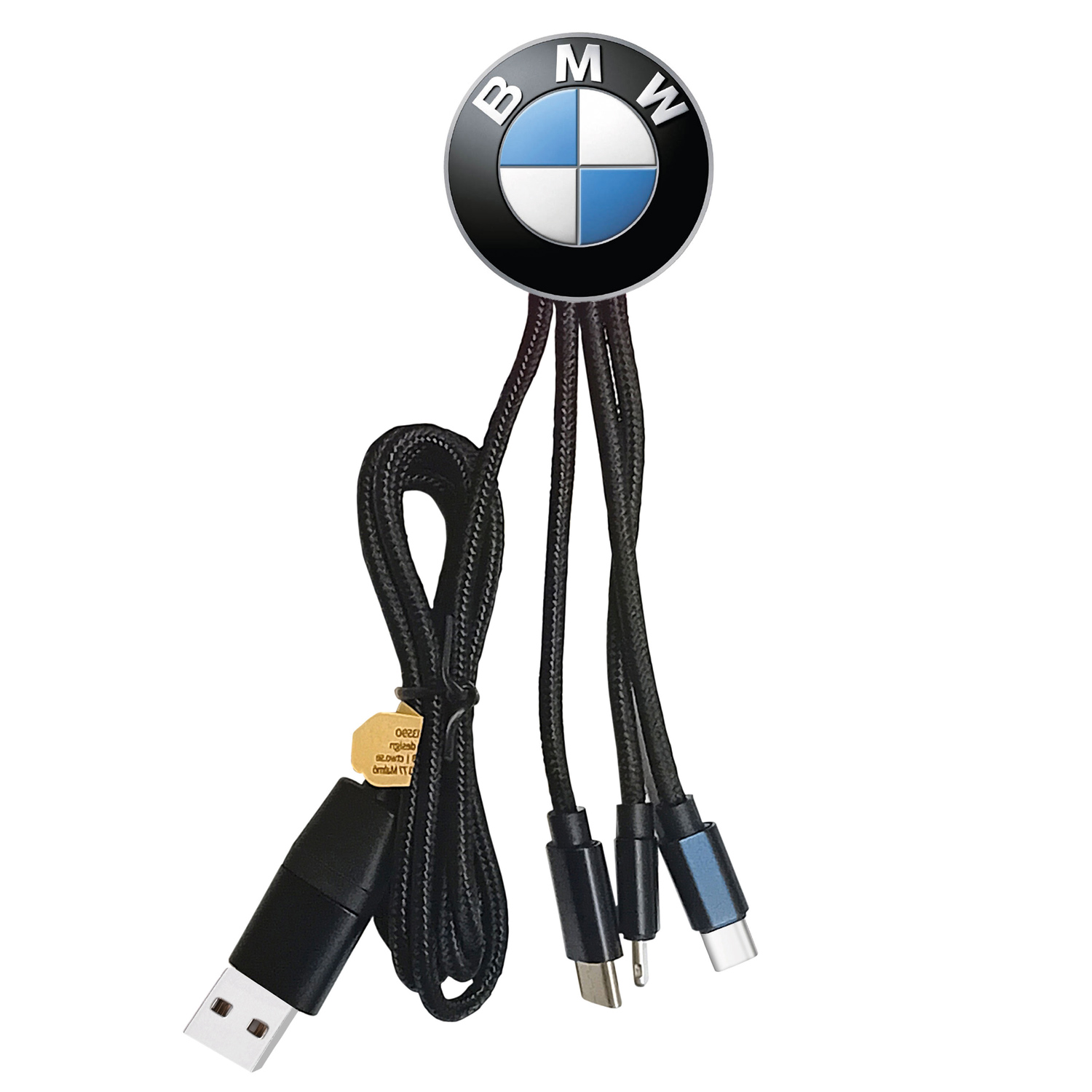 Innovatives 5-in-1 Ladekabel mit vielseitigen Anschlüssen: USB-A mit einem USB Typ C Adapter als Eingang und Ausgänge für iPhone Lightning, Type C sowie Micro USB. Kabel und Stecker wahlweise in Schwarz oder Silber. Der mittlere Teil kann in Größe, Farbe und Design individuell gestaltet werden – die Optionen sind nahezu unbegrenzt! Leistung: 5V / 2.1A; Länge: ca. 110 cm.
