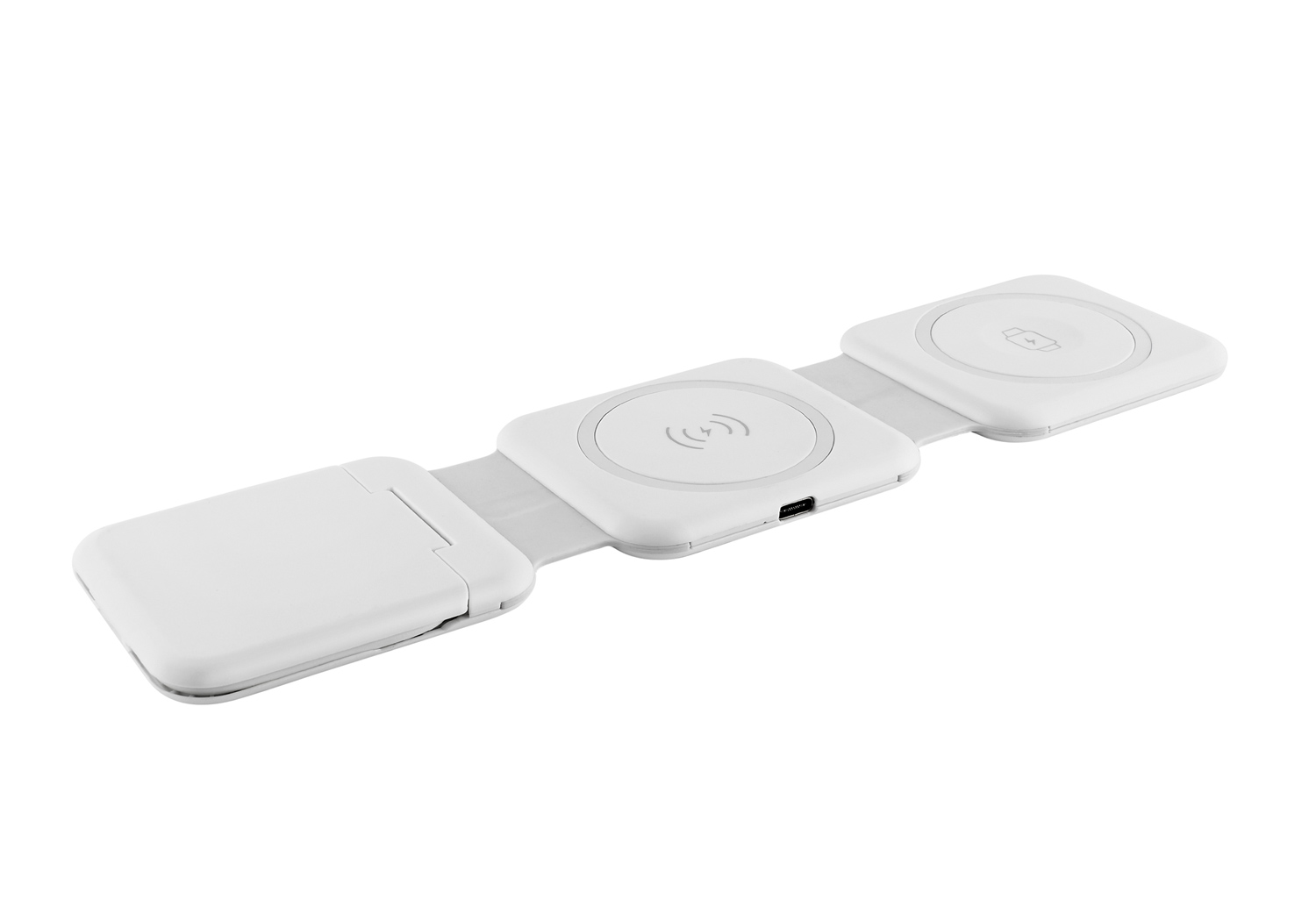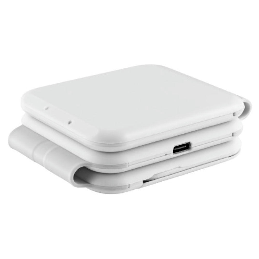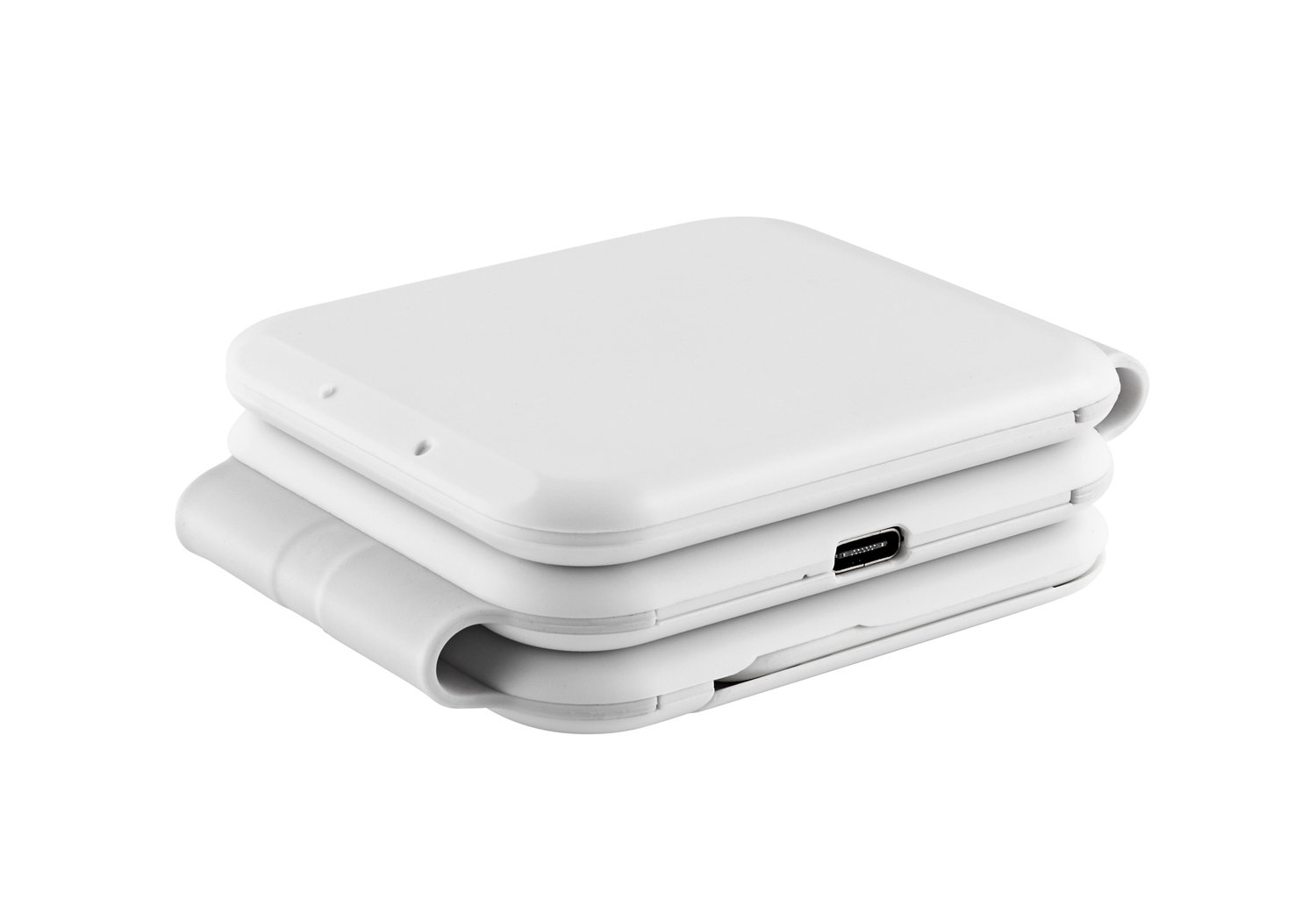 Faltbares sehr kompaktes Ladepad mit 2 Lademöglichkeiten - Wireless charging pad (15 Watt High speed) für Ihr kompatibles Smartphone, 2,5 Watt wireless pad für die Apple® Watch und kompatible Geräte - inkl. Kabel/Steckersatz zum Anschluss wirklich aller Geräte. Aus RABS Kunststoff (Recyclinganteil >20 %), im Designkarton