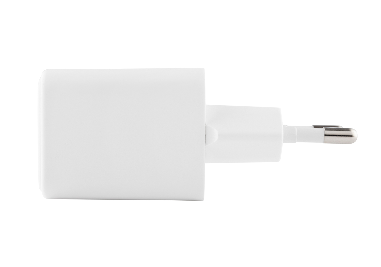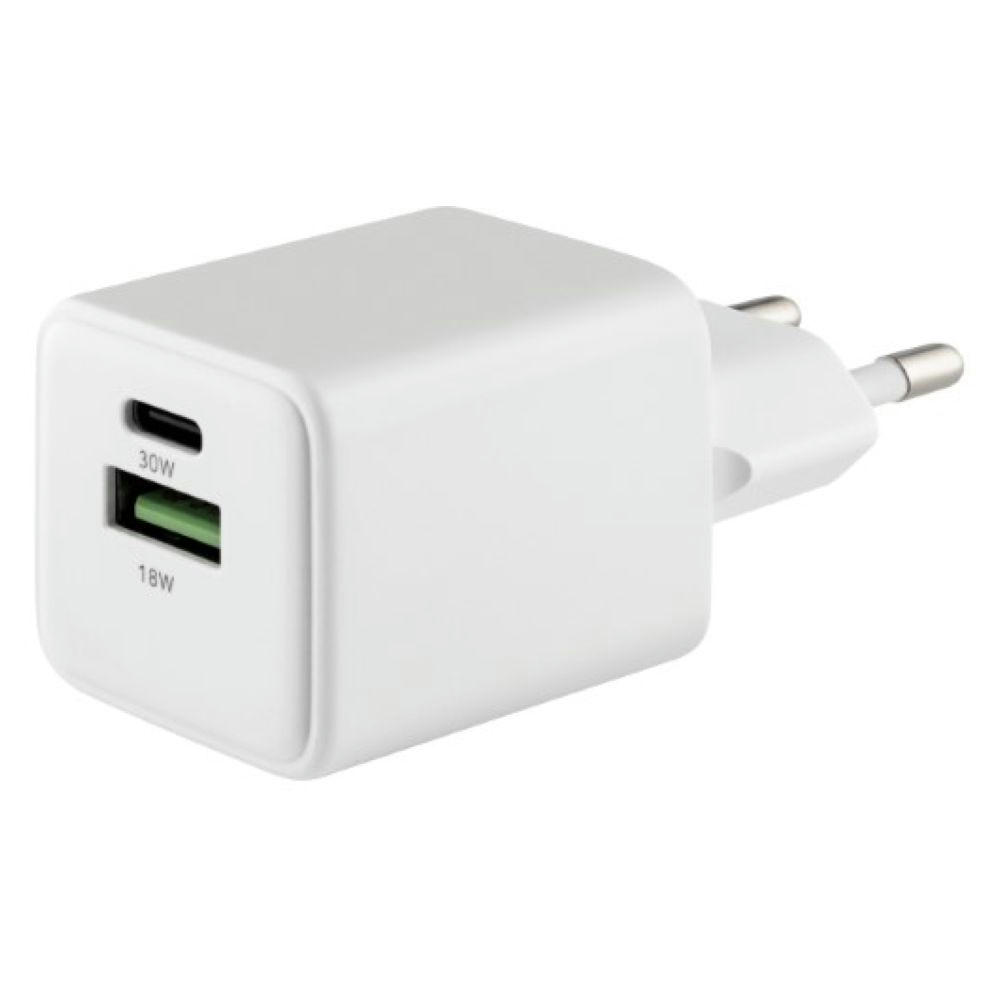 Wall charger - GAN (Galliumnitrid) Technologie mit 20% höherer Effektivität trotz schlanker Bauform, mit 2 Ports (USB-C: 30 W, USB-A: 18 W), im Designkarton.