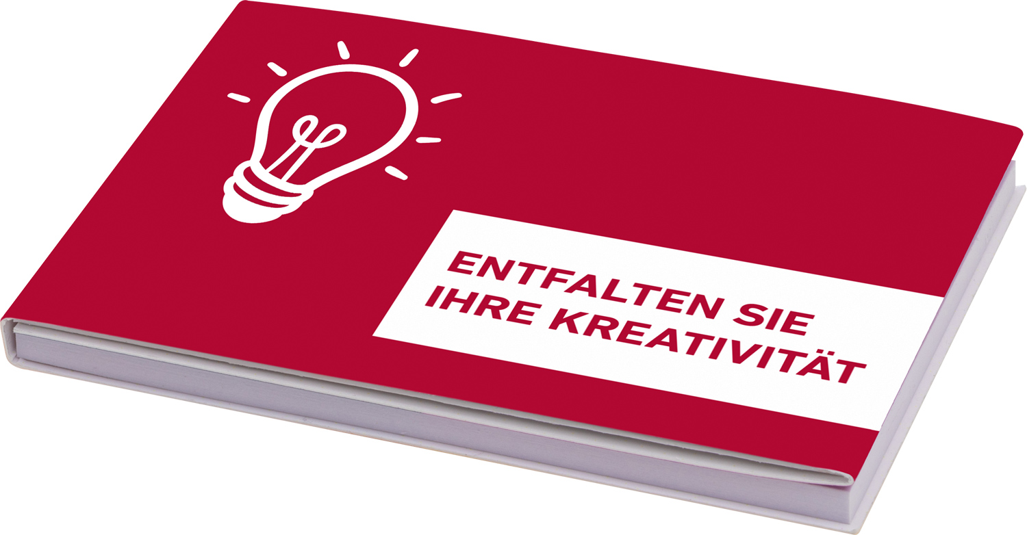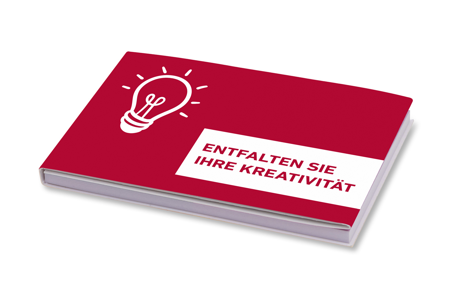 Kartoncover-Leporello seitlich zu öffnen, mit Haftnotizen + Leaflet.Haftnotizen innen rechts mit 50 Blatt 10 x7,5 cm, weiß, 80g und 2-farbigem Druck, einseitig. Leaflet gefaltet mit 7 Druckflächen à 10 x 7,5 cm, Bilderdruckpapier 130g und 4-farbigem Druck, beidseitig. Kartoncover mit 4-farbigem Druck. Einzeln mit Banderole verschlossen.