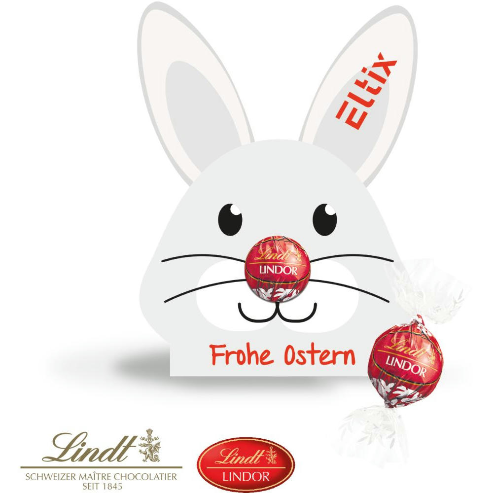 Süßes Osterlächeln mit Kugelnase! Ein Hingucker mit Charme: Die individuell bedruckbare Werbekarte in Hasenform überrascht mit einer zartschmelzenden Lindor Kugel als glänzende „Nase“. Verspielt, hochwertig und sympathisch – das perfekte Give-Away zu Ostern für Kunden und Mitarbeiter. Ein Präsent, das sofort ein Lächeln zaubert und garantiert in Erinnerung bleibt. Produktdetails: Lindt Lindor Kugel, verpackt in einer individuellen Werbekartonage. Nachhaltigkeit: Für jede Bestellung mit uns wird ein Baum über GROW MY TREE gepflanzt. Wir verwenden FSC® zertifizierten Karton aus nachhaltiger Forstwirtschaft und anderen kontrollierten Quellen. Inhalt: 1 Lindt Lindor Kugel (ca. 12,5 g) mit einer zartschmelzenden Füllung.