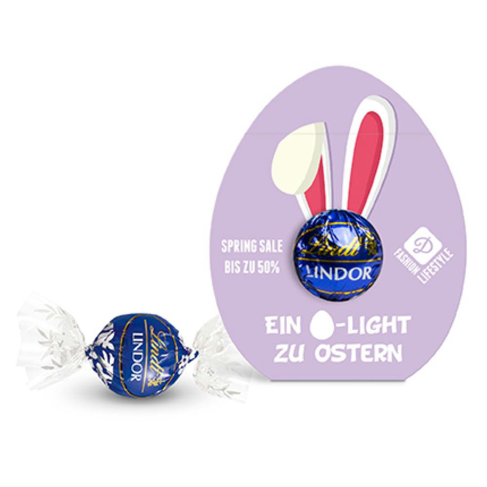 Feinste Lindor Kugel aus Milchschokolade oder Schokolade feinherb in individuell bedruckter Klemmkartonage in Ostereiform. Variante : Lindt Lindor Kugel in Werbekartonage "Osterei" | 12,5 g | Milchschokolade | Kartonage | 4c Euroskala