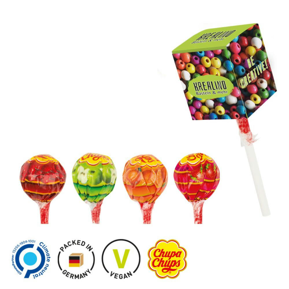 Chupa Chups Kugel Lolly Sour in Werbebox aus weißem Karton, individuell bedruckt. Inhalt: 1 Chupa Chups Kugel Lolly sour, Geschmacksrichtungen: Apfel Sour, Zitrone Sour, Erdbeere Sour, 12 g. Inkl. 1-4c-Druck.