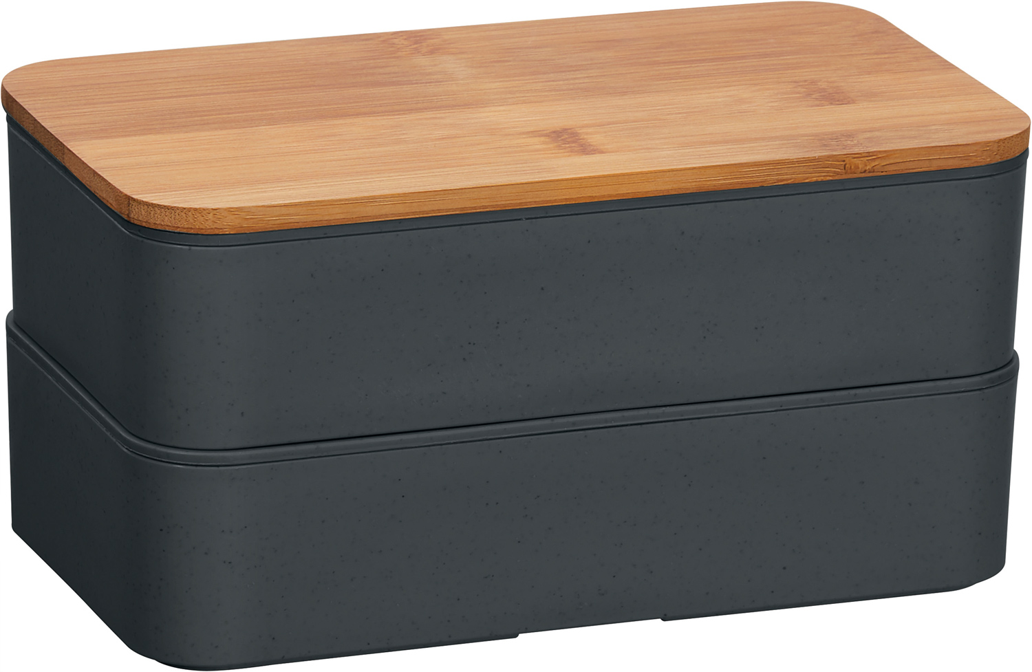 Nachhaltiges Doppel – mit Bambusdeckel und Besteck. Mit Elastikband und Besteckset.