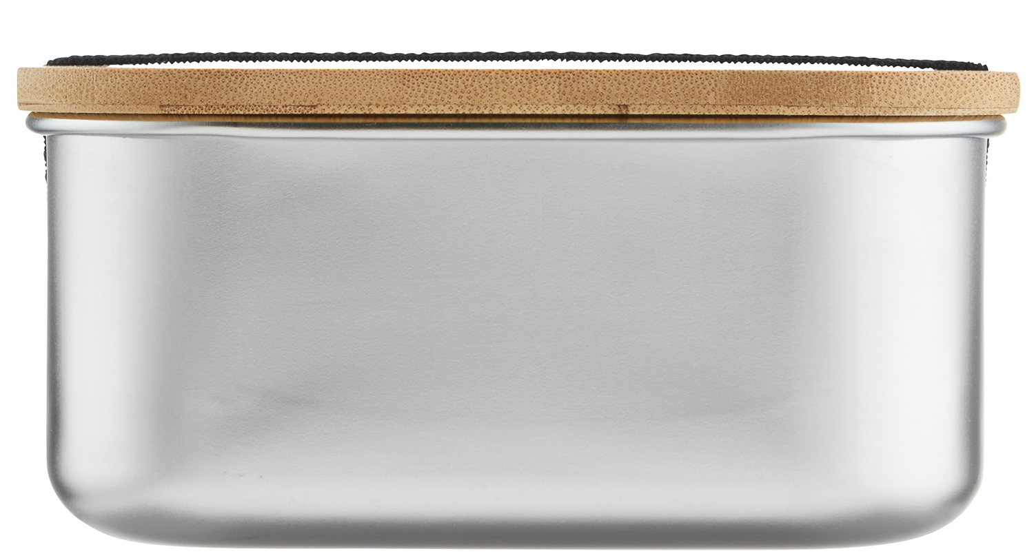 Edelstahl-Lunchbox 1,35L mit Bambusdeckel und elastischem Halteband. Spülmaschinengeeignet (mit Ausnahme des Deckels). Auch in der Größe S /1,0 L erhältlich.