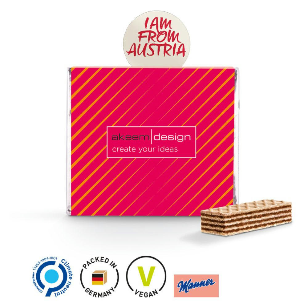 Manner Neapolitaner mit Werbeschuber aus Karton, individuell bedruckt. Inhalt: Knusprige Manner Waffel gefüllt mit Haselnusscreme, 75 g