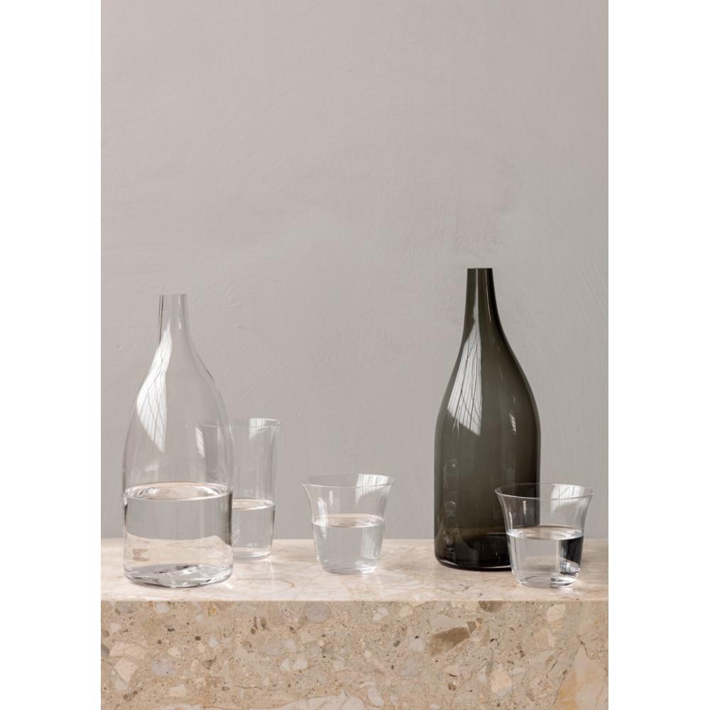 Die Kopenhagener Architekten Mentze Ottenstein ließen sich bei der Gestaltung ihrer Strandgade-Serie für MENU von ihrem Viertel inspirieren, benannt nach der historischen Straße, in der sie wohnen. Die Strandgade-Karaffe aus mundgeblasenem Glas hat eine asymmetrische Silhouette, die gut in der Hand liegt und das Ausgießen von Flüssigkeiten erleichtert. Sie wurde für das Servieren von Kaltgetränken entwickelt und vereint Funktion und Nostalgie. Die kleinere Flasche ist aus klarem Glas geformt, während die größere einen dunkleren Farbton aufweist. Jedes einzelne Design variiert in Größe und Form, da jedes Stück handgefertigt ist.