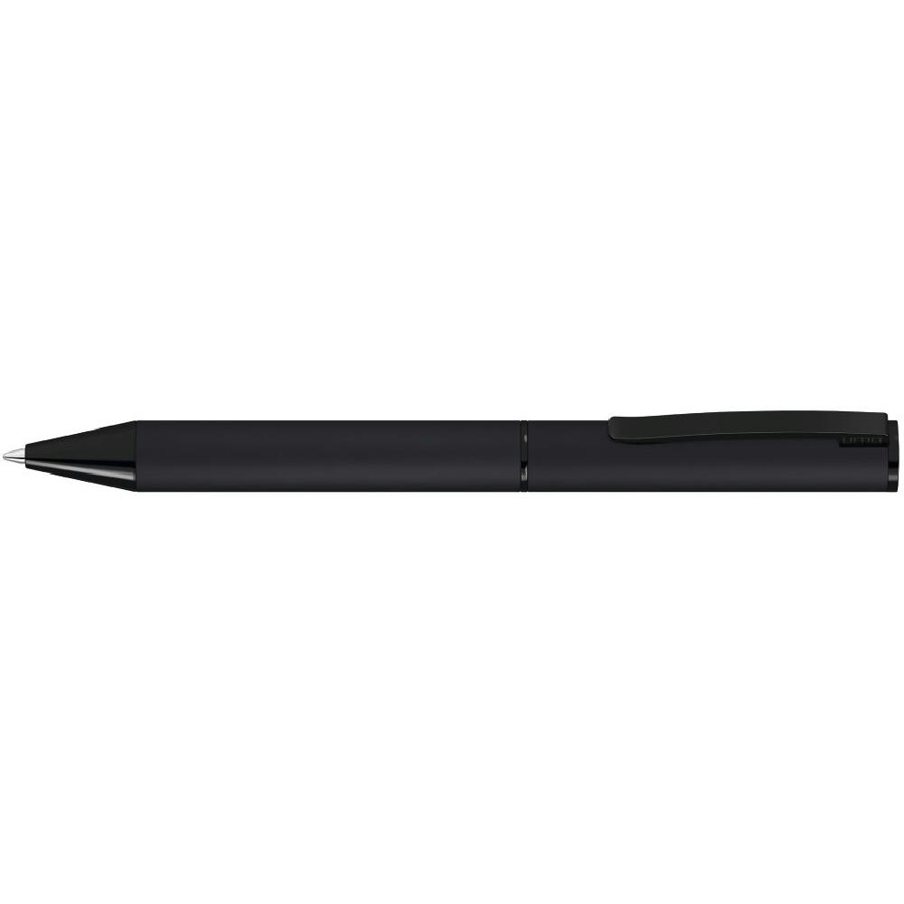Metall-Drehkugelschreiber mit Softtouch-Gehäuse, Softdrehmechanik und gefedertem Metallclip. Beschlagteile schwarz glänzend lackiert.