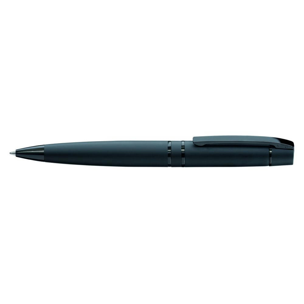 Metall-Drehkugelschreiber mit Softtouch-Gehäuse, Softdrehmechanik und gefedertem Clip. Beschlagteile schwarz glänzend lackiert. Material: Metall. Farbe: schwarz. Preis ab 100 St.