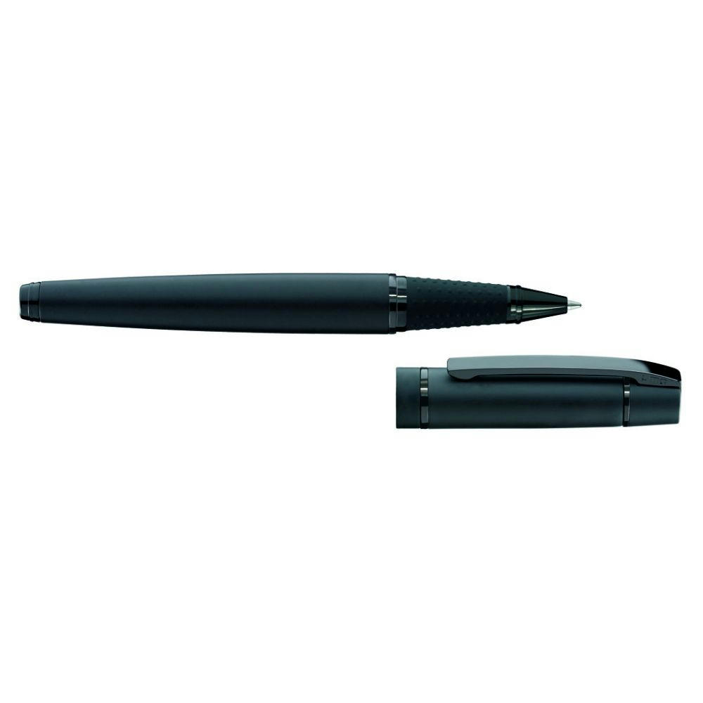 Metall-Rollerball mit Softtouch-Gehäuse, gefedertem Clip und rutschfester Gummigriffzone. Beschlagteile schwarz glänzend lackiert. Material: Metall. Farbe: schwarz. Preis ab 100 St.