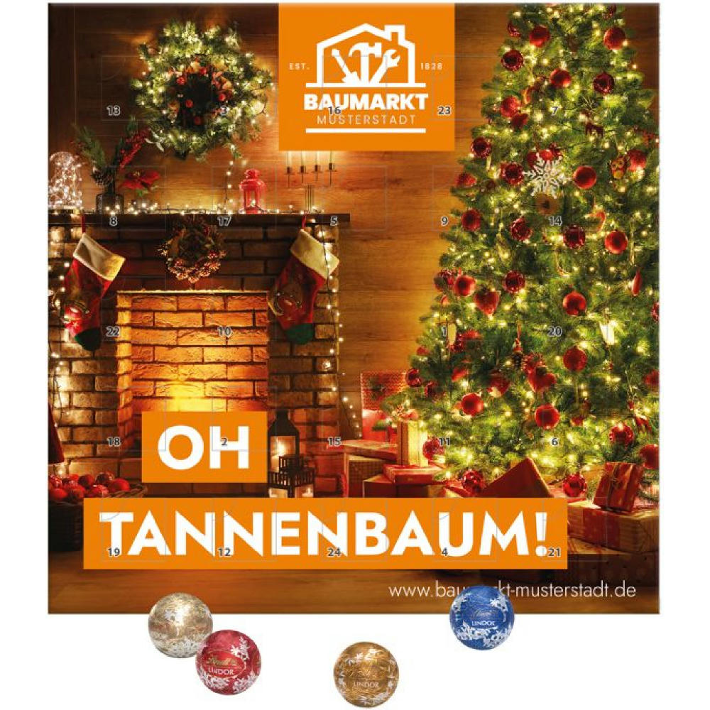 Adventskalender in Vollkartonhülle mit kompostierbarem Inlay, individuell bedruckt. Mit ausklappbarem Tischaufsteller und Aufhänger im Rücken integriert. Inhalt: 24 LINDOR Mini Kugeln von Lindt, bunt gemischt, 109 g Saisonartikel - solange der Vorrat reicht!