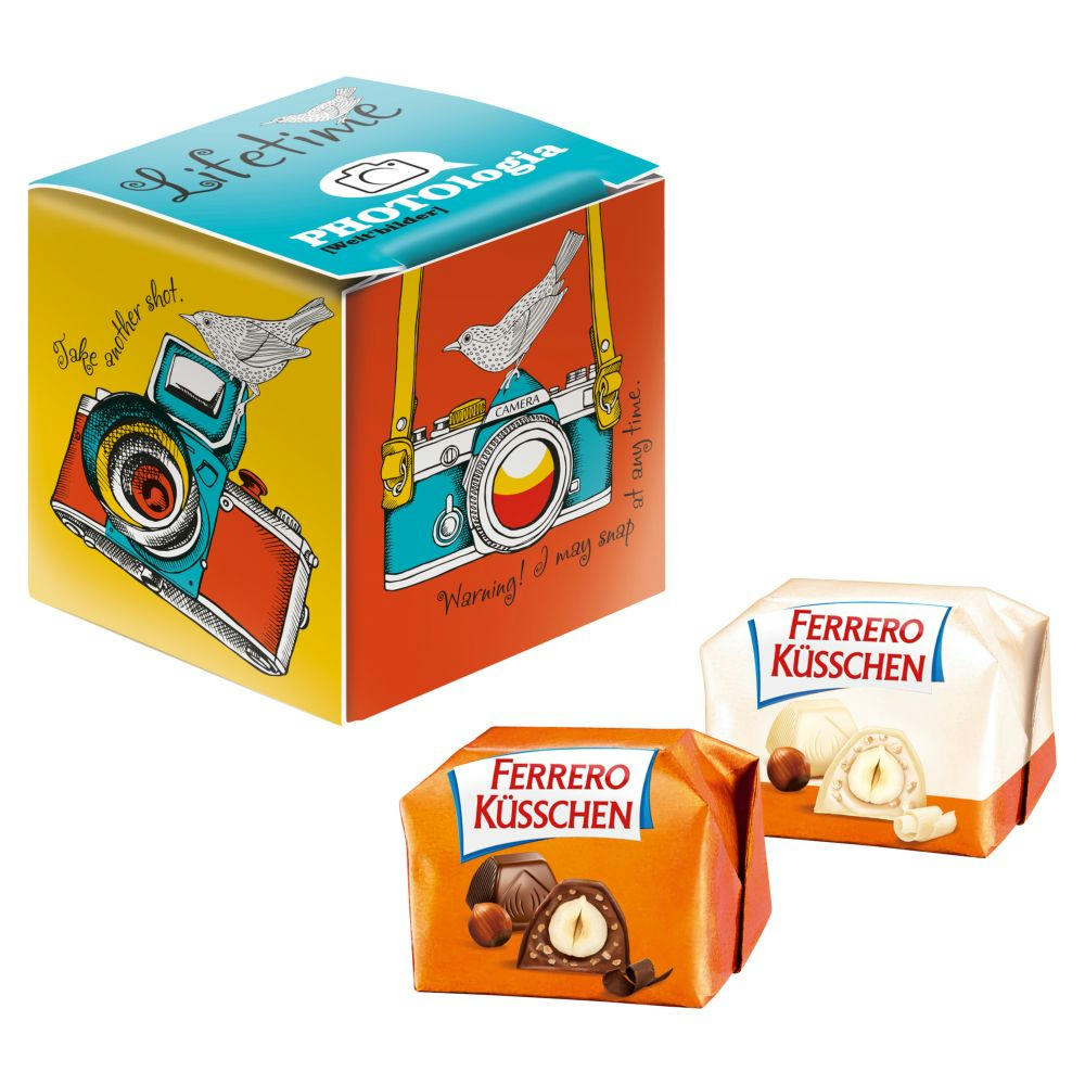 Weiße Mini-Kartonage in Würfelform gefüllt mit Ferrero Küsschen. Solange Vorrat reicht. Bitte Sommerpause beachten! Haltbarkeit: ca. 3 Monate. Preis inkl. 4c-Druck.