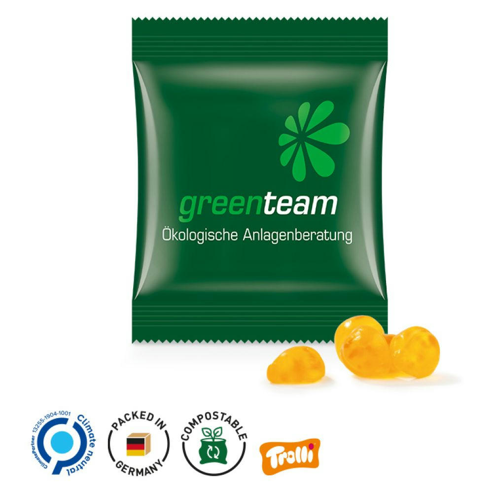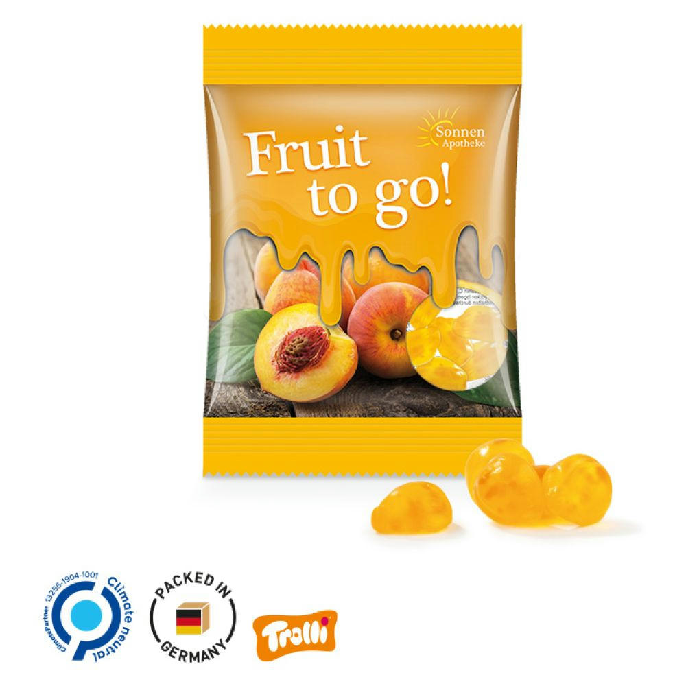 Trolli Fruchtgummi in Tüte aus weißem, recyclingfähigem Papier, individuell bedruckt. Inhalt: Trolli Vitamin-Fruchtgummi, mit Fruchtsaft, fruchtigen Stückchen und 10 Vitaminen, in der Geschmacksrichtung Pfirsich, 15 g.