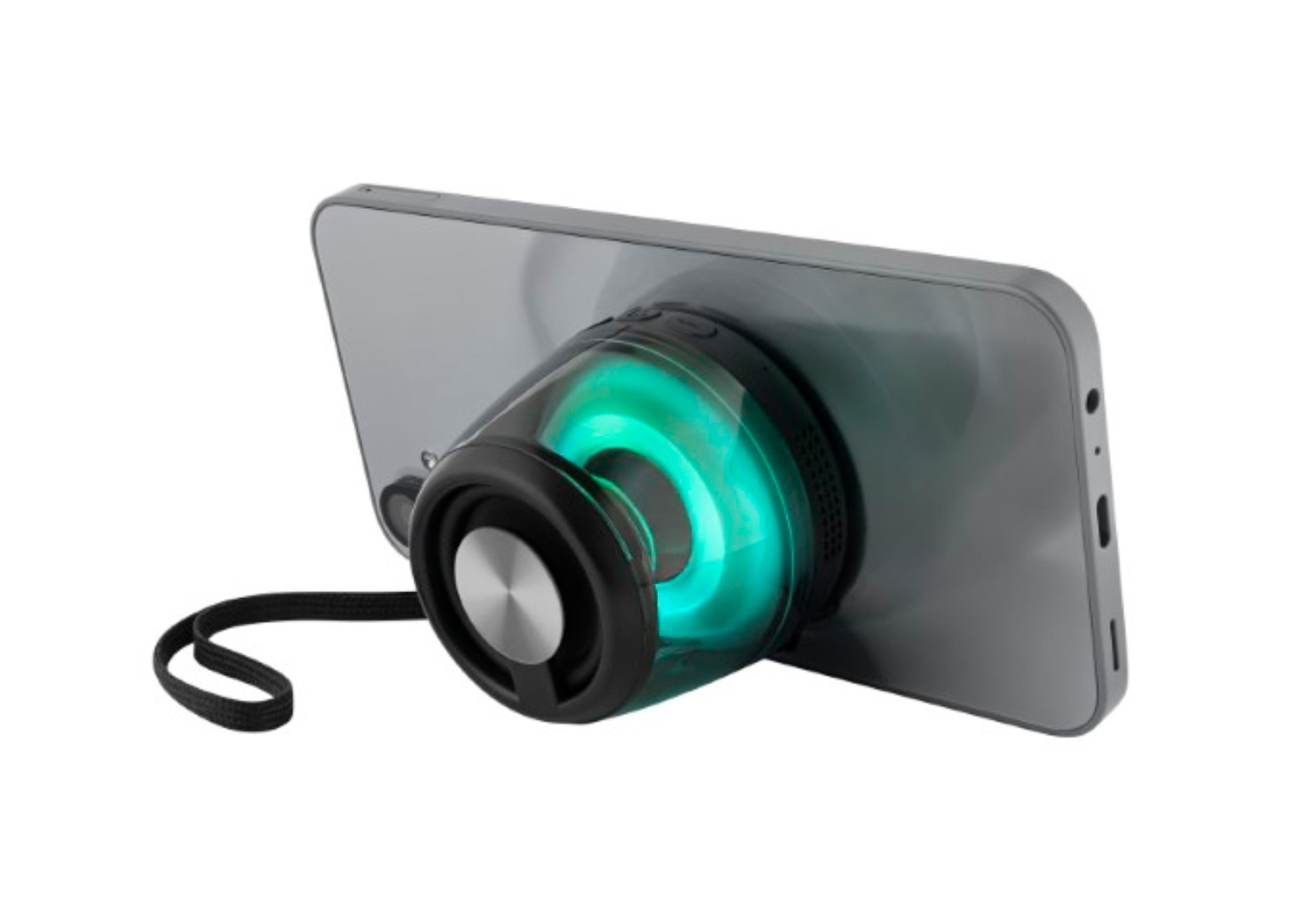 Bluetooth-Lautsprecher für unterwegs. Dank MagSafe-Technologie lässt er sich sicher und bequem am Handy befestigen und bietet kristallklaren Sound. 5 Watt Power, inclusive wiederaufladbarer Batterie mit 600 mAh für 3-3,5h Musikgenuss (2h Ladezeit), inkl. Aufhängelasche, Wireless Standard 5.3 , per TWS sind 2 Boxen koppelbar. Die integrierte RGB-Lichtshow lässt sich auf Wunsch ausschalten. In recycelten Craft Paper Box, inkl. USB-C Kabel.