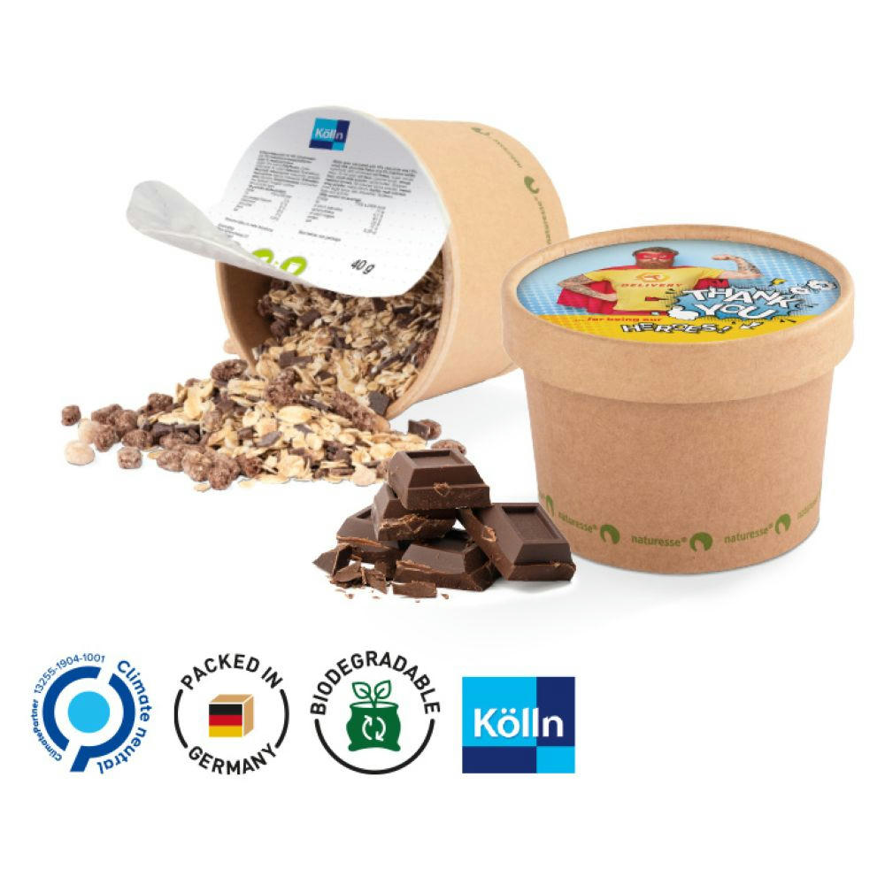 Kölln Schoko Hafer-Müsli, im Becher aus schnell nachwachsenden, sich selbst erneuerbaren Ressourcen, individuell bedruckt. Inhalt: Kölln Original Schoko-Hafer-Müsli, 40 g (kann mit Milch im Becher zubereitet werden). Haltbarkeit: 4 Monate.