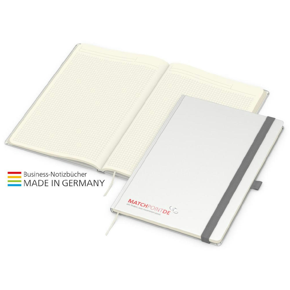 Modern und mit Vollausstattung: Vision-Book in mattem, glattem Kunstledereinband und farblich abgestimmter Vollausstattung mit Gummiband und Stiftschlaufe.