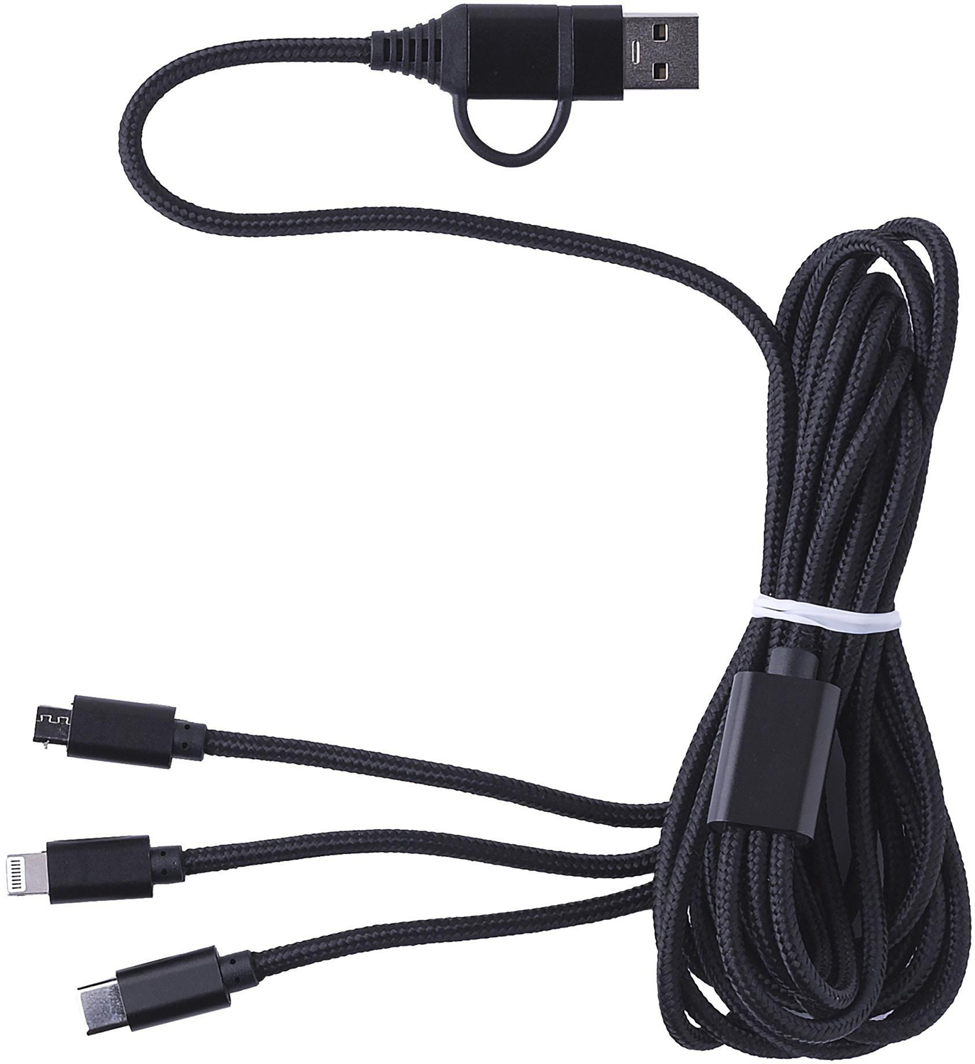 Nylon-Ladekabel. ca. 290cm Länge, 1,5A Geschwindigkeit. A+C Anschluss, Micro, Typ-C und Lightning.