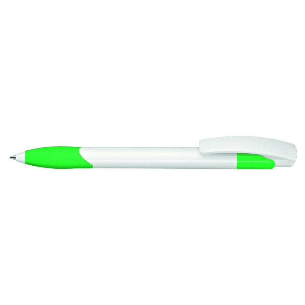 Druckkugelschreiber mit gedeckt glänzendem Schaft und Clipdrücker in weiß. Gummigriffzone und Manschette farbig.