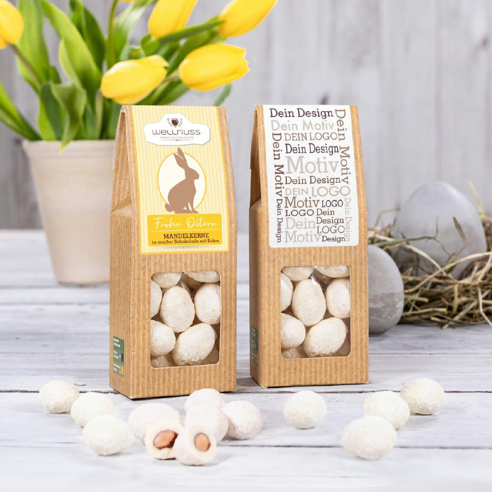 Ab 250 Stück mit Ihrem Motiv im 4c Druck auf dem Etikett der Faltschachtel, ab 2.500 Stück vollflächig bedruckt im Offsetdruck: Der aufmerksamkeitsstarke Bestseller. Die Faltschachtel als nachhaltiges Premium-Giveaway. Hier kommt ein Kokos Snack in der perfekten Mini-Osterei-Form. Und einem Geschmack, der perfekt die Süße der weißen Schokolade, die Aromatik der Kokosflocken und die herbe Mandelnote verbindet.