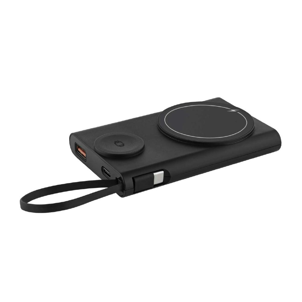 Leistung in einem kompakten Format. Mit PD (Power Delivery) 20 Watt Fast Charging Technologie (kabelgebunden) – Dualport In- oder Output. Schnelles kabelloses Laden per Magsafe® Wireless Fast Charging (15 Watt inkl. 3 Watt für Airpod®), zweites Induktionsfeld speziell für die Apple® Watch (2.5W) optimiert. Auch andere Geräte können mit dem s zusätzlich eingebauten Kabels (USB-C) sofort und überall mit Energie versorgt werden. Der integrierte Sicherheitskreislauf (SecuityCircuit) schützt vor Über-, Unterladung, Überspannung und Überhitzung. Hergestellt aus recycelten Materialien. Mit verstecktem Handyaufsteller. In Craft Paper Box.