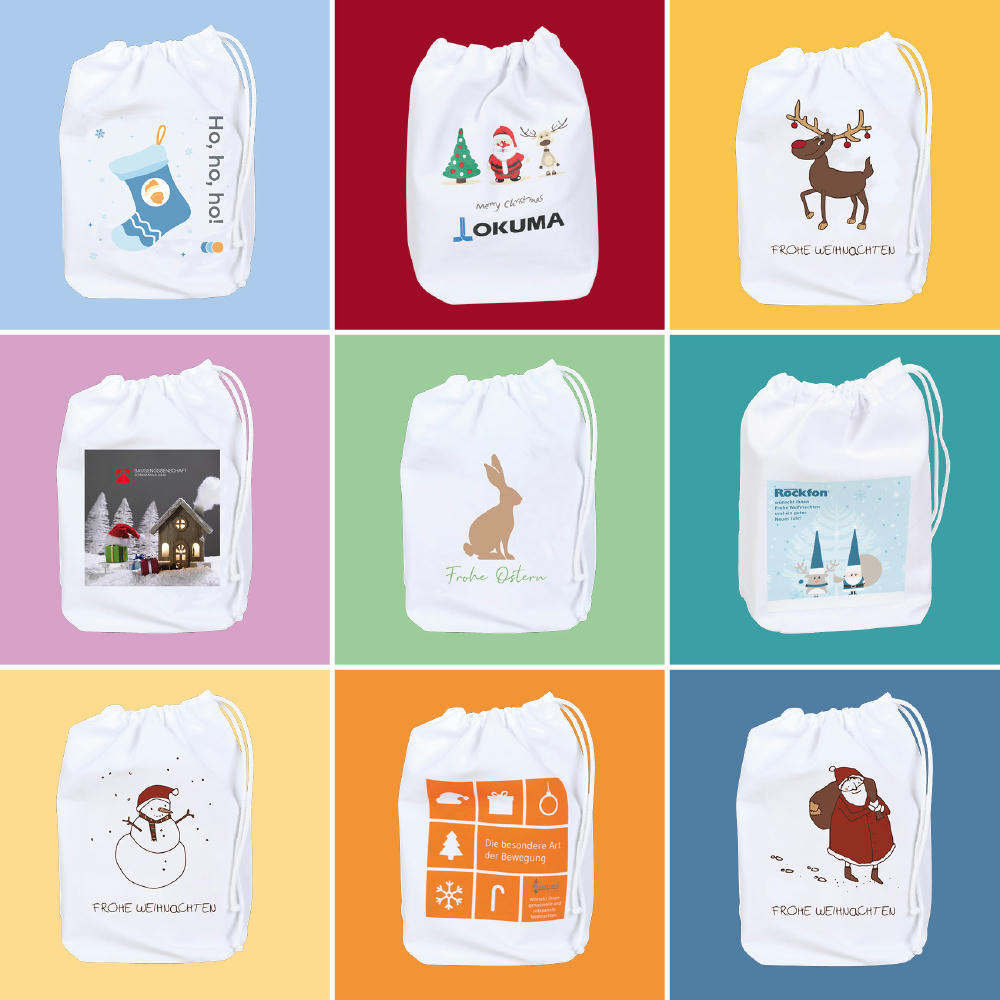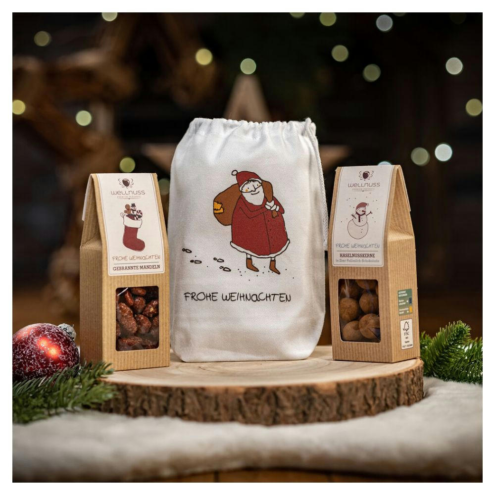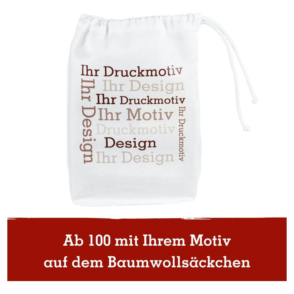 Individuell bedruckbares Baumwollsäckchen befüllt mit 2 Snack-Kompositionen in einer Faltschachtel nach Ihrer Wahl. Wählen Sie aus verschiedenen Premium Snacks (ohne künstliche Zusatzstoffe und frei von Gentechnik) wie: Trüffelmandeln mit Kakao (70g), Haselnusskerne mit Vollmilchschokolade und Zimt (60 g), Schoko-Crispies mit weißer Schokolade, Kürbiskernen und Erdbeeren (70 g), Kaffeebohnen mit Zartbitterschokolade (60 g), Cranberries & Edelnüsse (70 g), Cashewkerne, Walnusskerne & Pekanusskerne (60 g), Salzmandeln mit leichter Rauchnote, Cranberries und Weinbeeren (60g), Cranberries in Zartbitterschokolade und Cashewkerne (70 g), Ofengeröstete Cashewkerne mit Chili (60 g), Ofengeröstete Cashewkerne mit Curry (60 g), Gebrannte Mandeln - (60 g), Weihnachtsedition - Trüffelmandeln mit Kakao (70g), Weihnachtsedition - Haselnusskerne mit Vollmilchschokolade und Zimt (60 g), Weihnachtsedition - Cranberries & Edelnüsse (70 g). Preis inkl individuellem Druck auf dem Baumwollsäckchen.