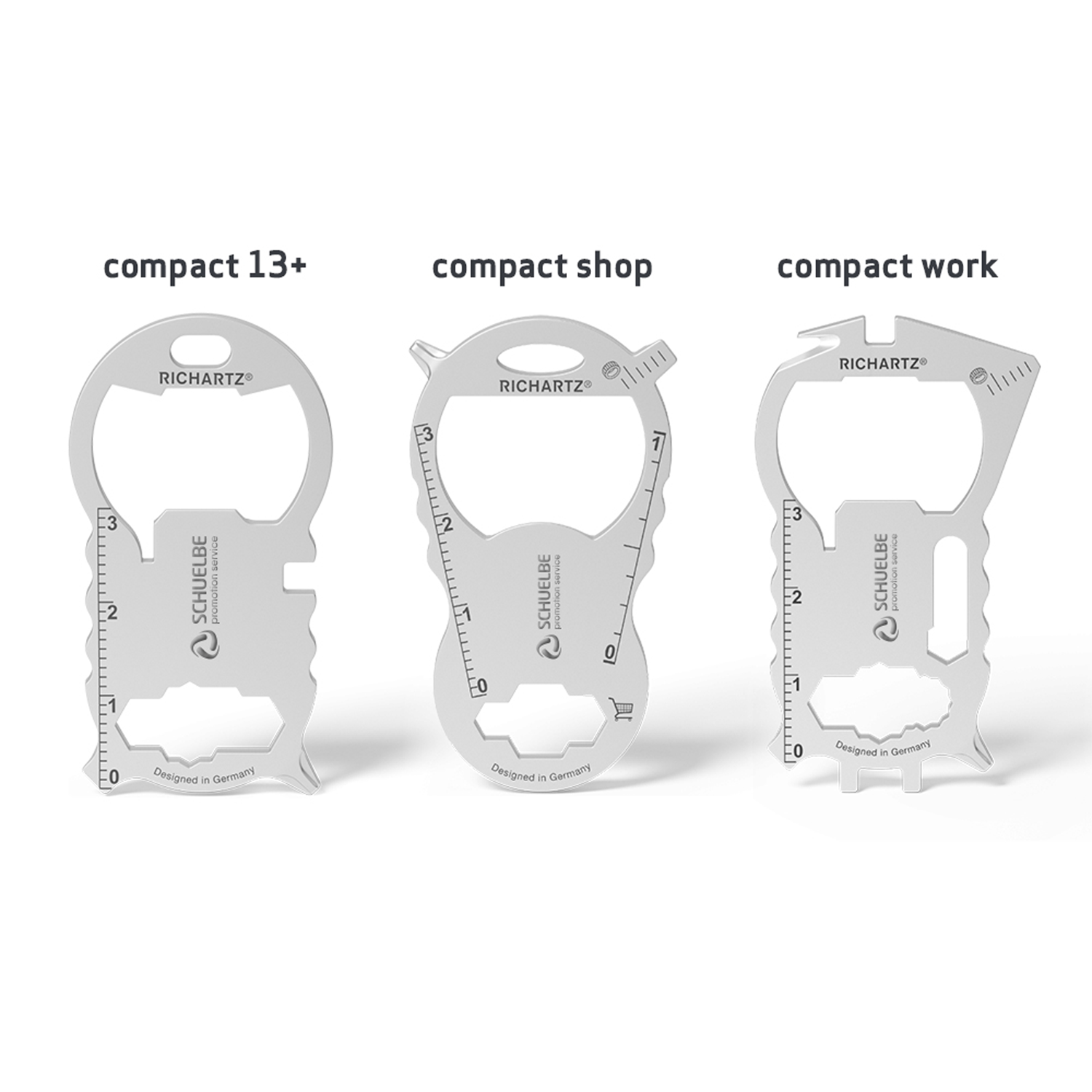 Praktisches Key Tool aus rostfreiem Edelstahl. Erhältlich in 3 Varianten mit verschiedenen Funktionen, wie z.B. Einkaufswagenlöser, Kapselheber, Schraubendreher u.v.m. Verfügbare Versionen: compact 13+, compact shop & compact work. Verpackt in individuell gestaltbarer Werbekarte.