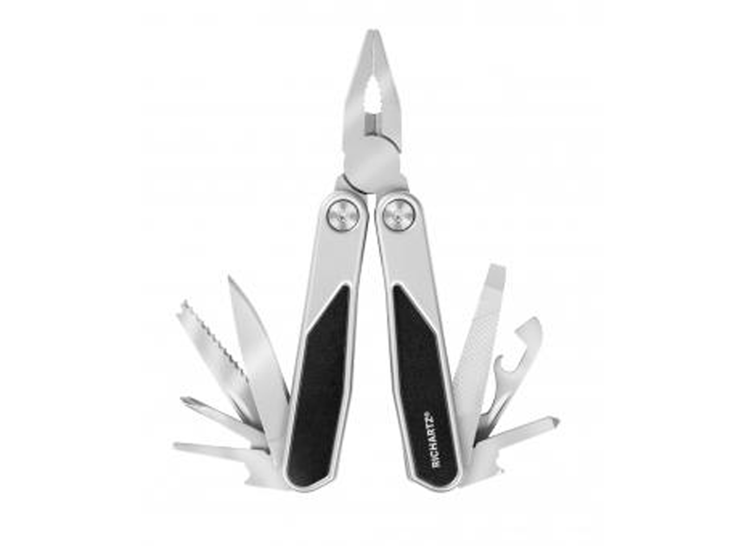 Das Multitool überzeugt durch hohe Präzision und professionelle Funktionen Jede Funktion ist einfach und präzise zu verriegeln und per Knopfdruck zu lösen. Funktionen: 1. Gegossene Zange, 2. DrahtSCHNEIDER, 3. Feile / Schlitzschraubendreher, 4. Dosenöffner / Kapselheber, 5. Schlitzschraubendreher, 6. Kreuzschlitzschraubendreher, 7. Säge, 8. große Klinge, 9. Glasbrecher, 10. Bit-Satz mit 9 Bits.