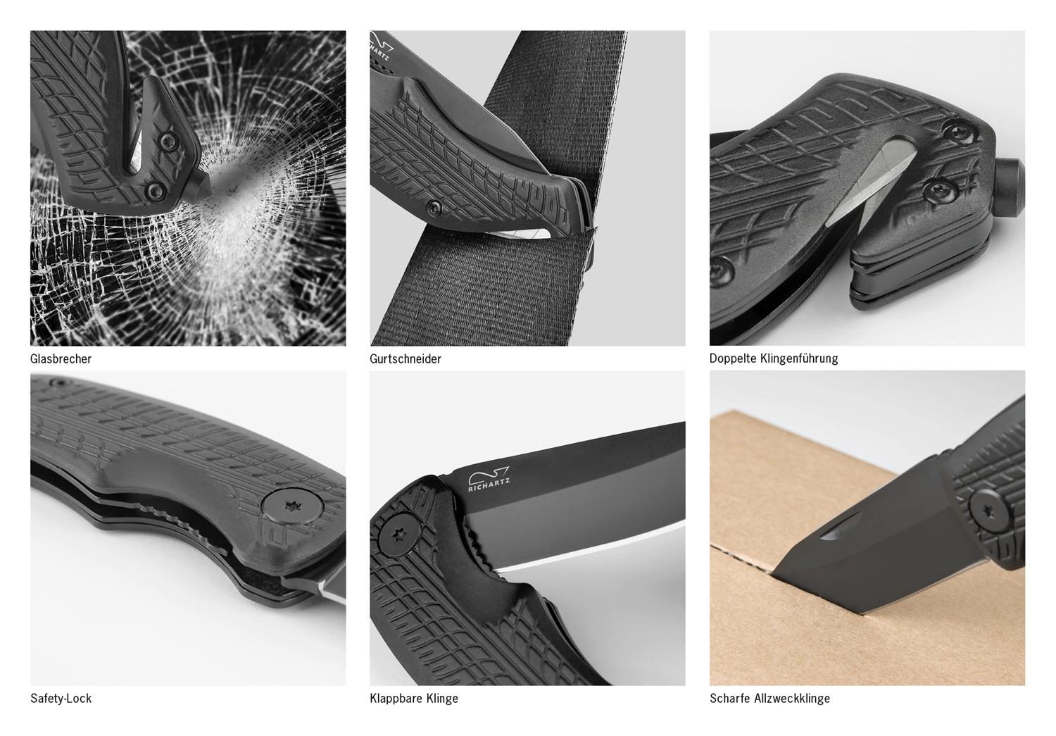Das schwarz beschichtete Tool mit kräftiger, rostfreier Klinge und Safety-Lock Klingenverriegelung gibt Sicherheit im täglichen Gebrauch. Der GurtSCHNEIDER mit doppelter Klingenführung garantiert den schnellen Schnitt. Der speziell gehärtete Werkzeugstahl des Glasbrechers ermöglicht das präzise Zerschlagen der Glasscheibe. Mit geprägter Reifenstruktur auf dem Griff und schwarz beschichteter Klinge.