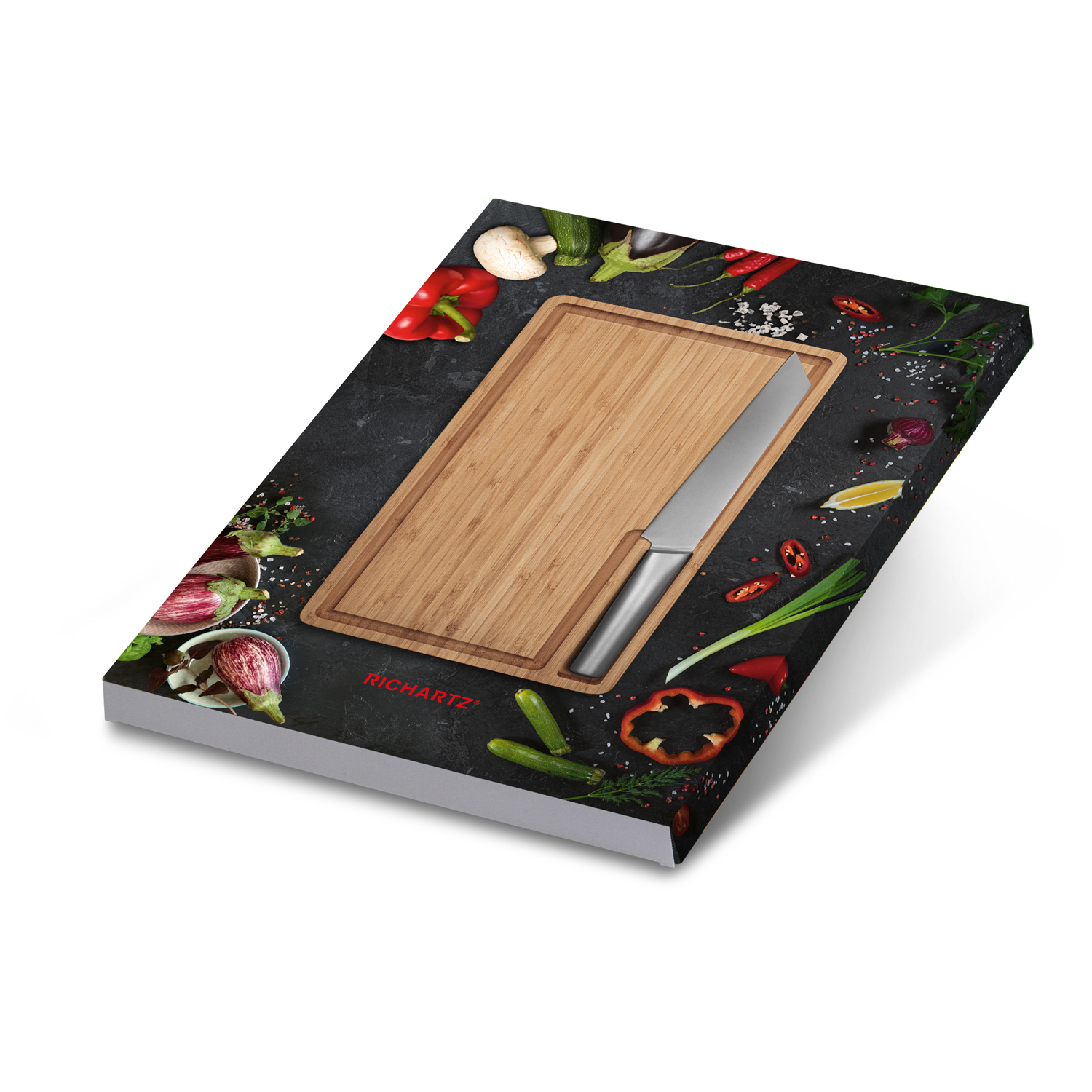 Das Küchenset kombiniert das hochwertige RICHARTZ Chefmesser mit einem Schneidbrett aus Holz. Zur Aufbewahrung findet das Chefmesser in der Griffmulde des Schneidbretts seinen Platz in welcher es magnetisch gehalten wird. Indiv. 4-c bedruckte Verpackung und Lasergravur auf Messer möglich.