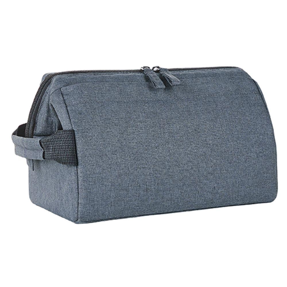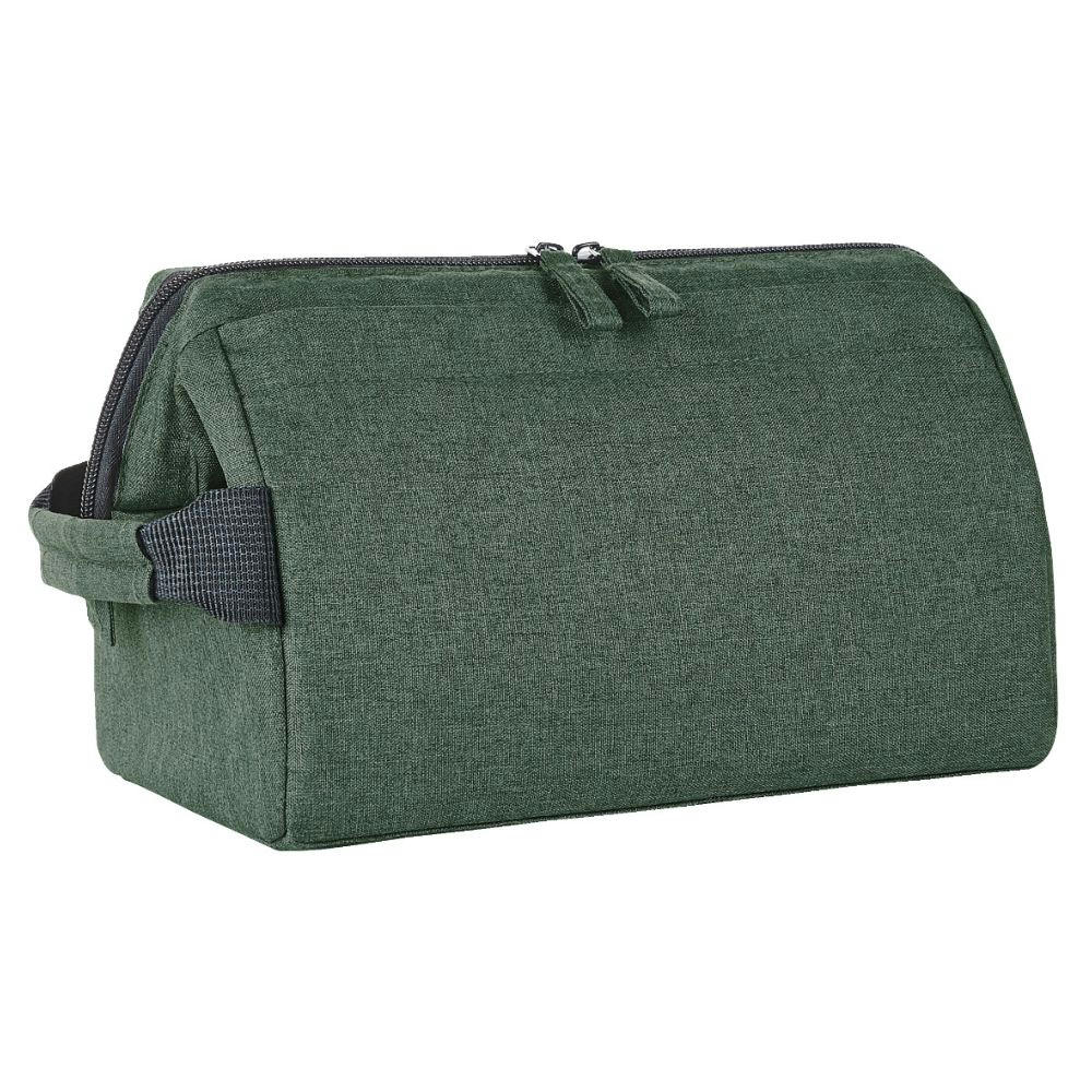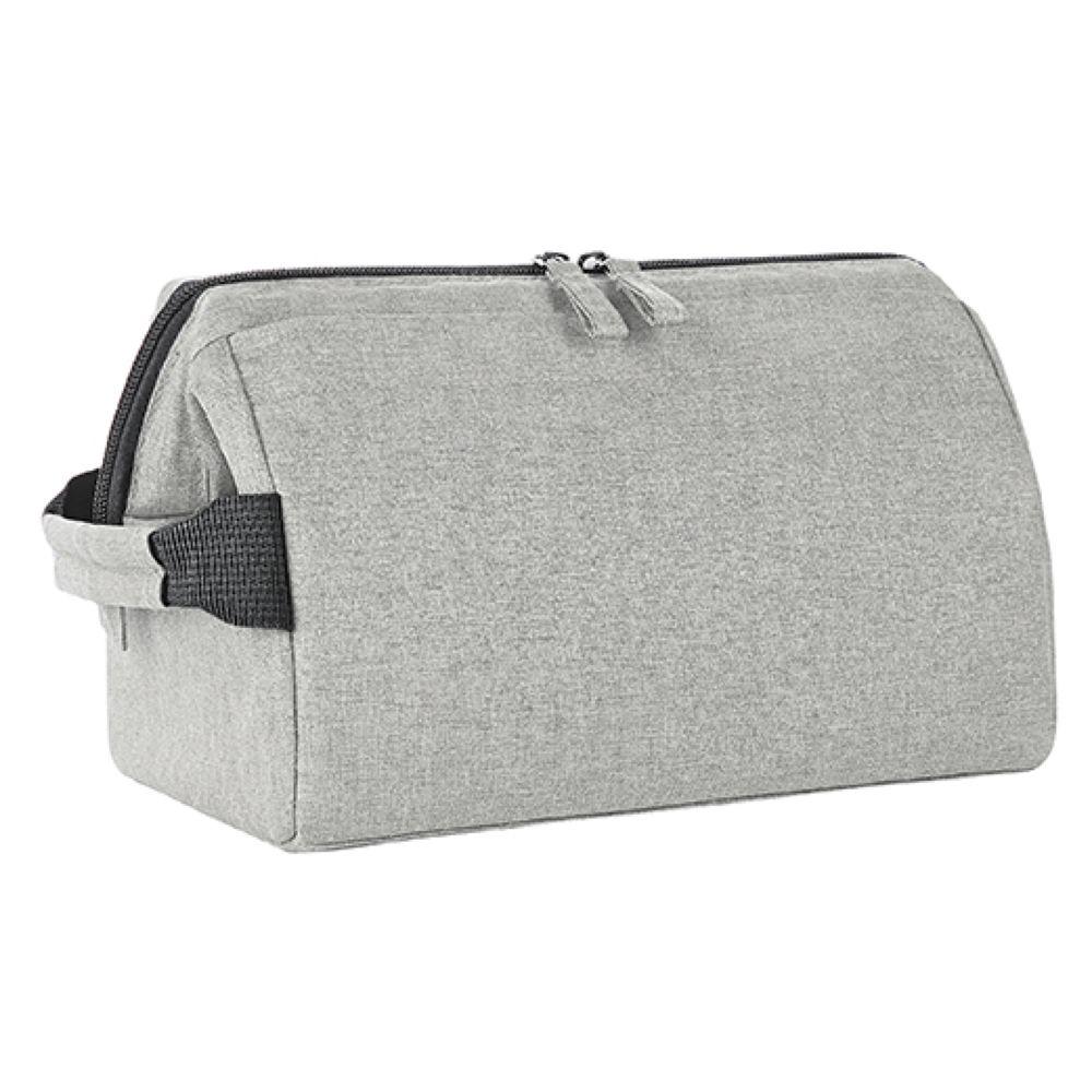 formschöne Reißverschlusstasche mit stabiler Metallbügelöffnung zum Aufstellen oder -hängen; rPET-Obermaterial; großes, gepolstertes Hauptfach mit diversen Organizer-Elementen; Reißverschlussvortasche; Handgriff