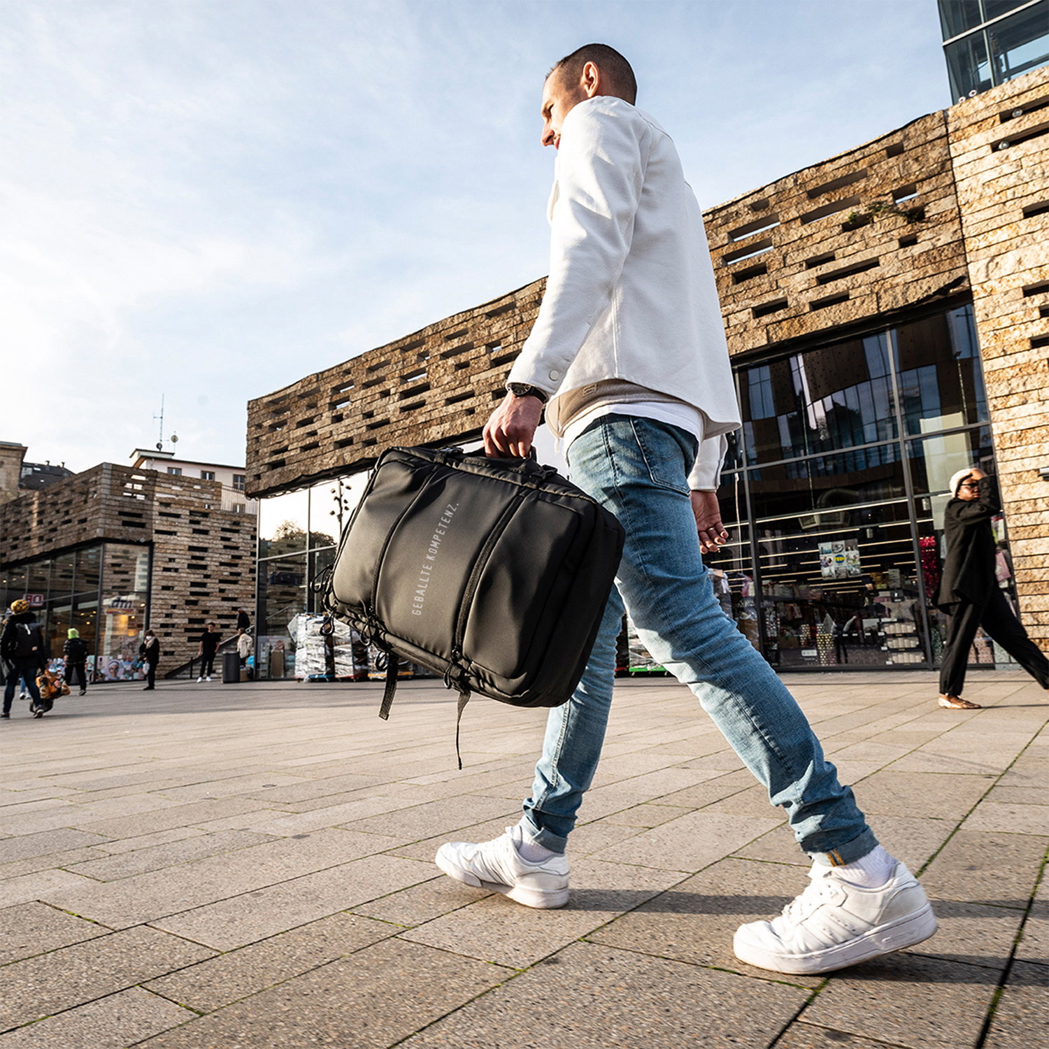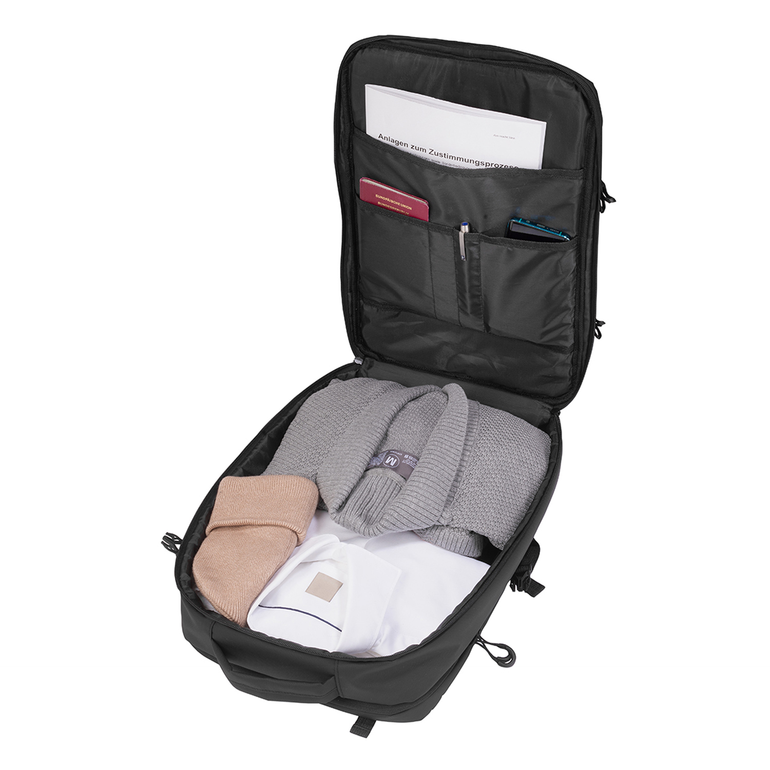 rundum gepolstert, 2-Wege Reißverschlusshauptfach mit innen, 2 großen sowie 2 kleinen Einsteckfächern und 2 Stiftefächer, großes Reißverschlussfach, 2 Reißverschlussvortaschen, Rückseite mit 2-Wege Reißverschlussfach für Laptop passend 17", seitliche Verstellschnallen, Rücken gepolstert, Trolleyschlaufe, verstellbare gepolsterte Tragegurte, gepolsterter Tragegriff an Längsseite, Volumen ca. 22l