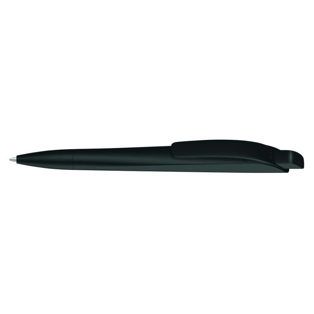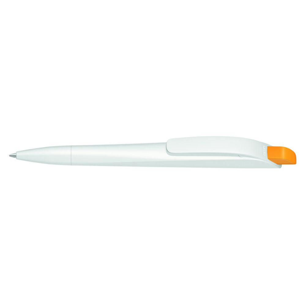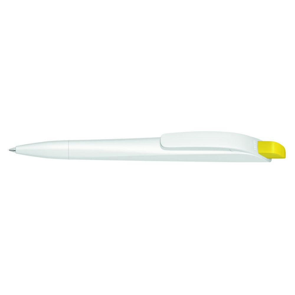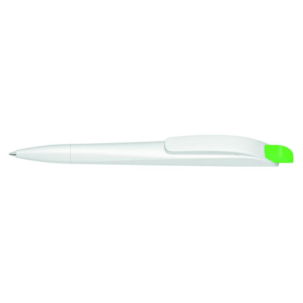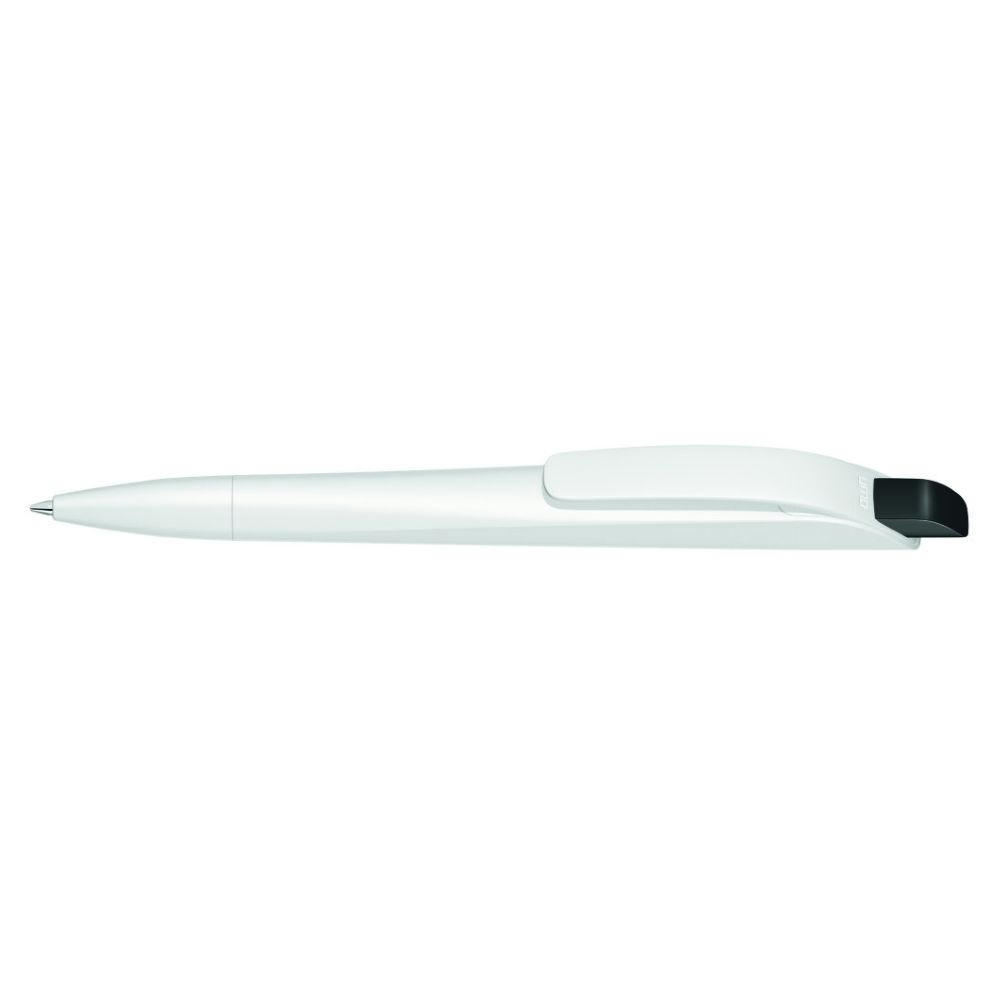 Druckkugelschreiber mit geometrisch wechselnder Schaftform. Gehäuse gedeckt matt schwarz oder weiß mit Bogenclip und farbigem Drücker.