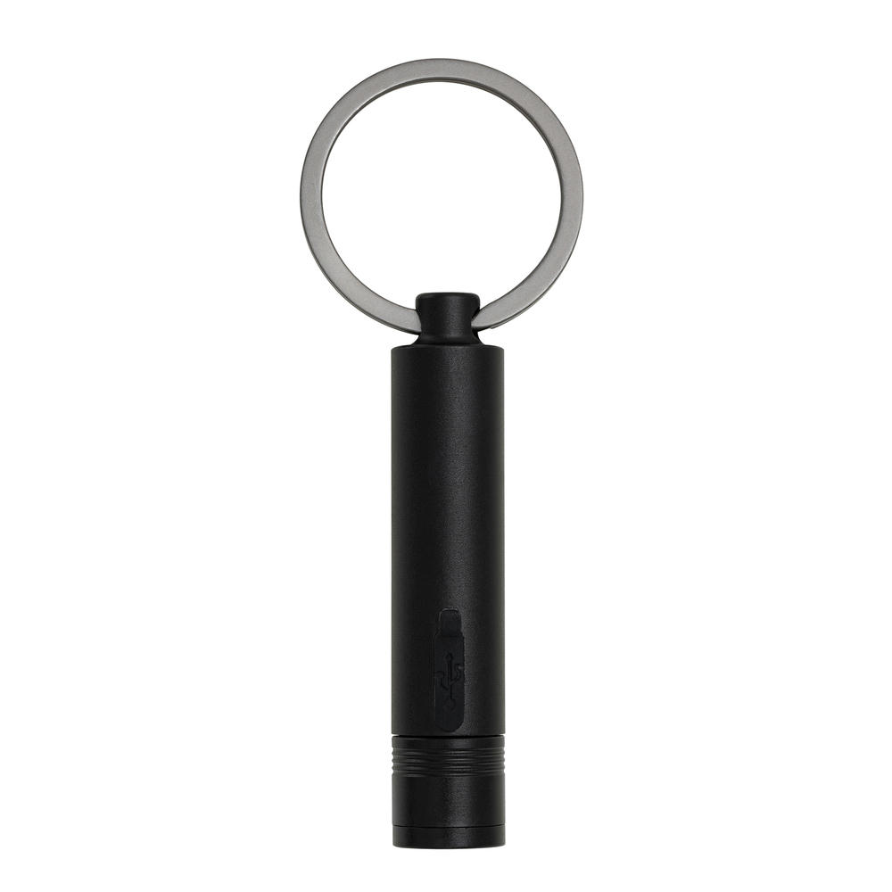 Schlüsselanhänger mit wiederaufladbarer LED-Taschenlampe (80 Lumen) mit USB-C-Anschluss aus schwarz eloxiertem Aluminium . Verstellbare Lichtintensitäten (zoombar auf 50% oder 100% Leuchtkraft). Leuchtdauer: 30 Minuten bei 100% Leuchtkraft; 75 Minuten bei 50% Leuchtkraft. 2,5 Stunden Ladezeit, 120 mAh Akku. Spritwassergeschützt IPX4. Inklusive USB-C-Ladekabel und Geschenkverpackung.