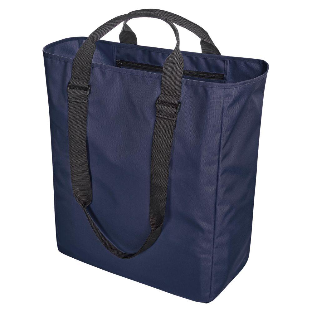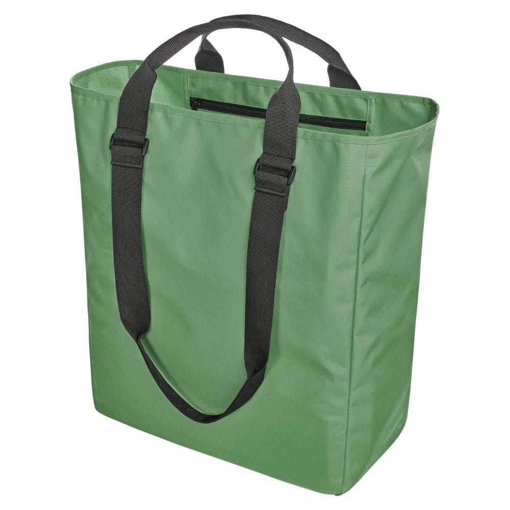 formschöner, großer Shopper; RPET-Obermaterial; Hauptfach mit hängendem Reißverschluss-Organizer; Tragesystem mit Doppelgriffen und dekorativer Schnalle