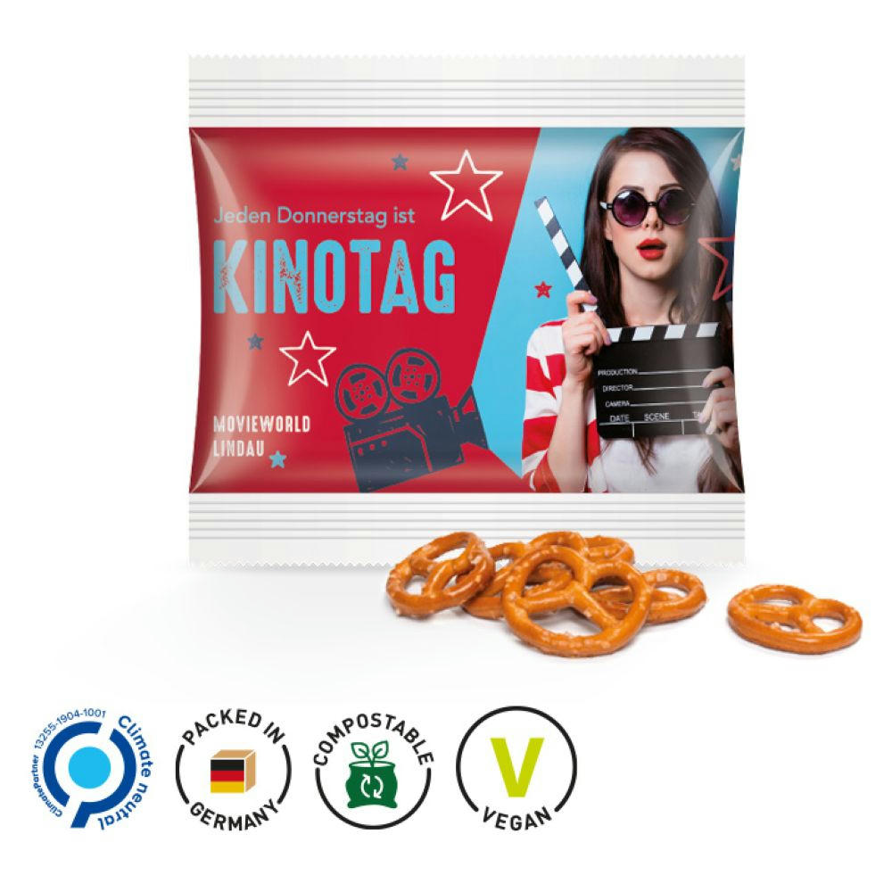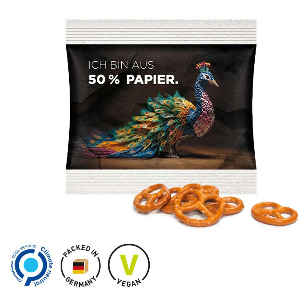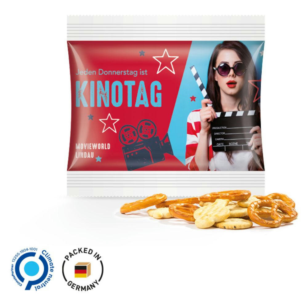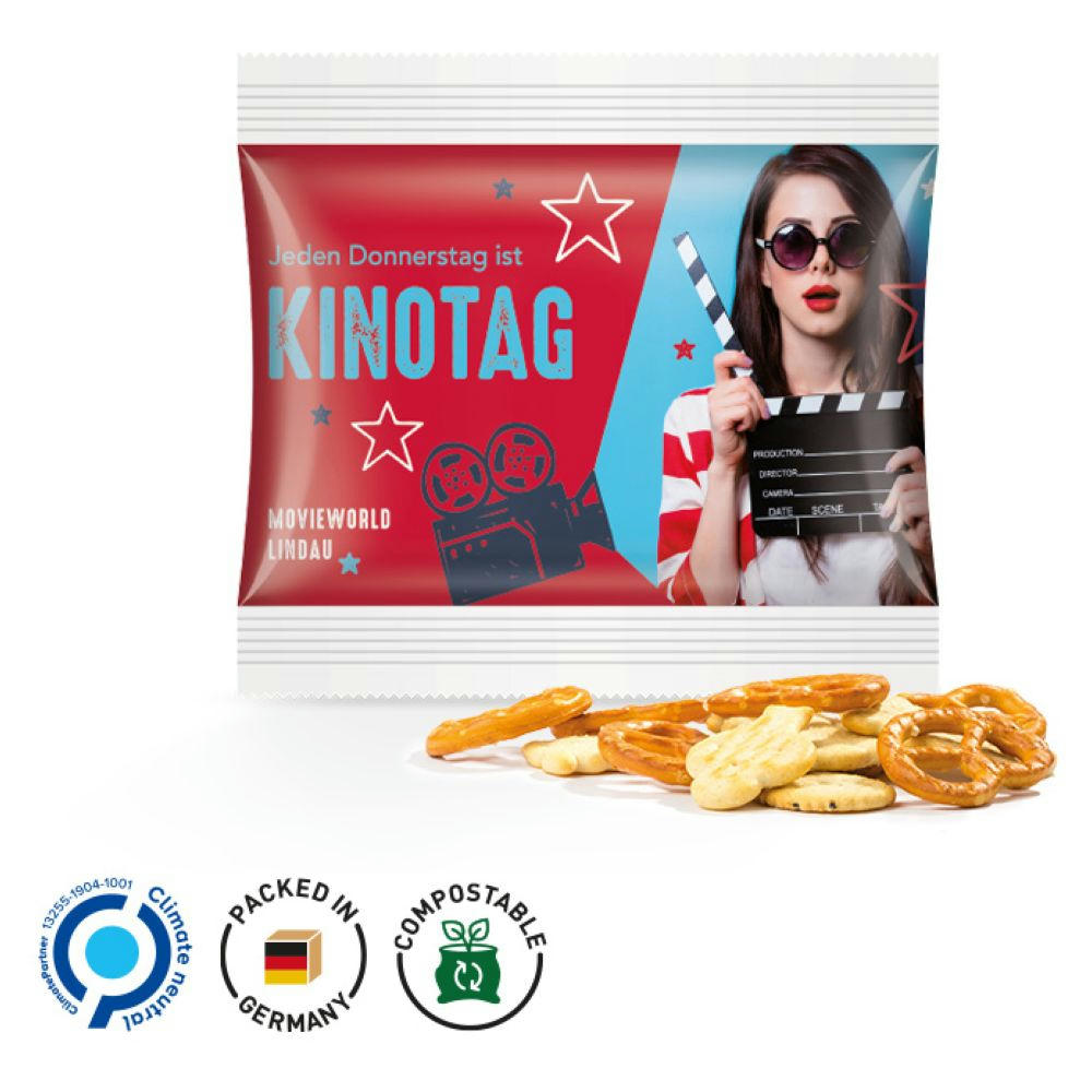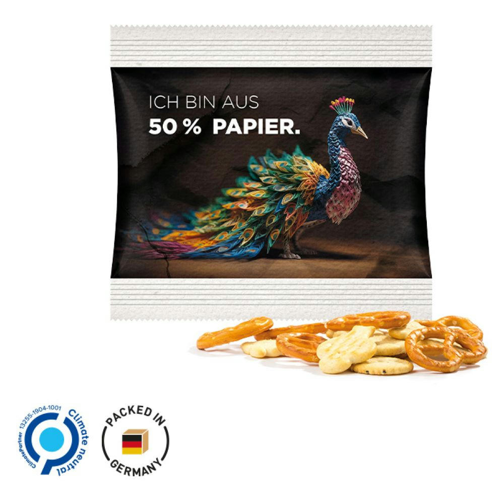 Snack Miditüte, weißes, recyclingfähiges Papier, individuell bedruckt. Inhalt: Knabbermix, 10 g.