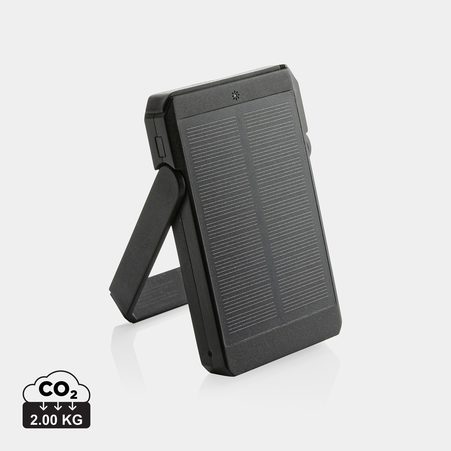 Solar-Powerbank aus RCS-zertifiziert recyceltem ABS. Gesamter recycelter Inhalt: 21% bezogen auf das Gesamtgewicht des Artikels. Die Powerbank verwendet hochwertige monokristalline Solarzellen mit einer Umwandlungsrate von 19%. Mit integrierter Standfunktion, um die Solarzellen in einem optimalen Winkel zu verwenden. Mit kabellosem, magnetischem 10W-Ladegerät zum kabellosen Aufladen Ihres Telefons. Aufladegeschwindigkeit Solar: 5V/130mA. Inout Type-C: 5V/2A. Output: USB A: 5V/2A; Type-C: 5V/2A. Artikel und Zubehör PVC-frei. Inklusive RCS-zertifiziert recyceltem TPE-Ladekabel.