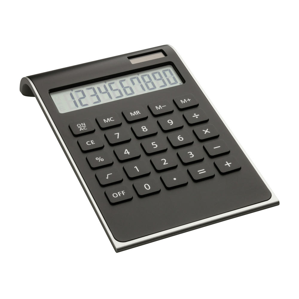Geschwungener und formschöner Tischrechner mit Dualpower (Solar und Batterie). Die Seiten des Taschenrechners sind farblich abgesetzt und bilden einen angenehmen Kontrast zur schlichten schwarzen Oberfläche. Die flachen Tasten des Solartaschenrechners sind schwarz mit goldenem Aufdruck. Die gut sichtbare Veredelungsfläche kann im Tampondruck (1 bis 4c) oder im UV Druck mit Logo veredelt werden. Das Display zeigt 10 Stellen und die Batterie ist enthalten.