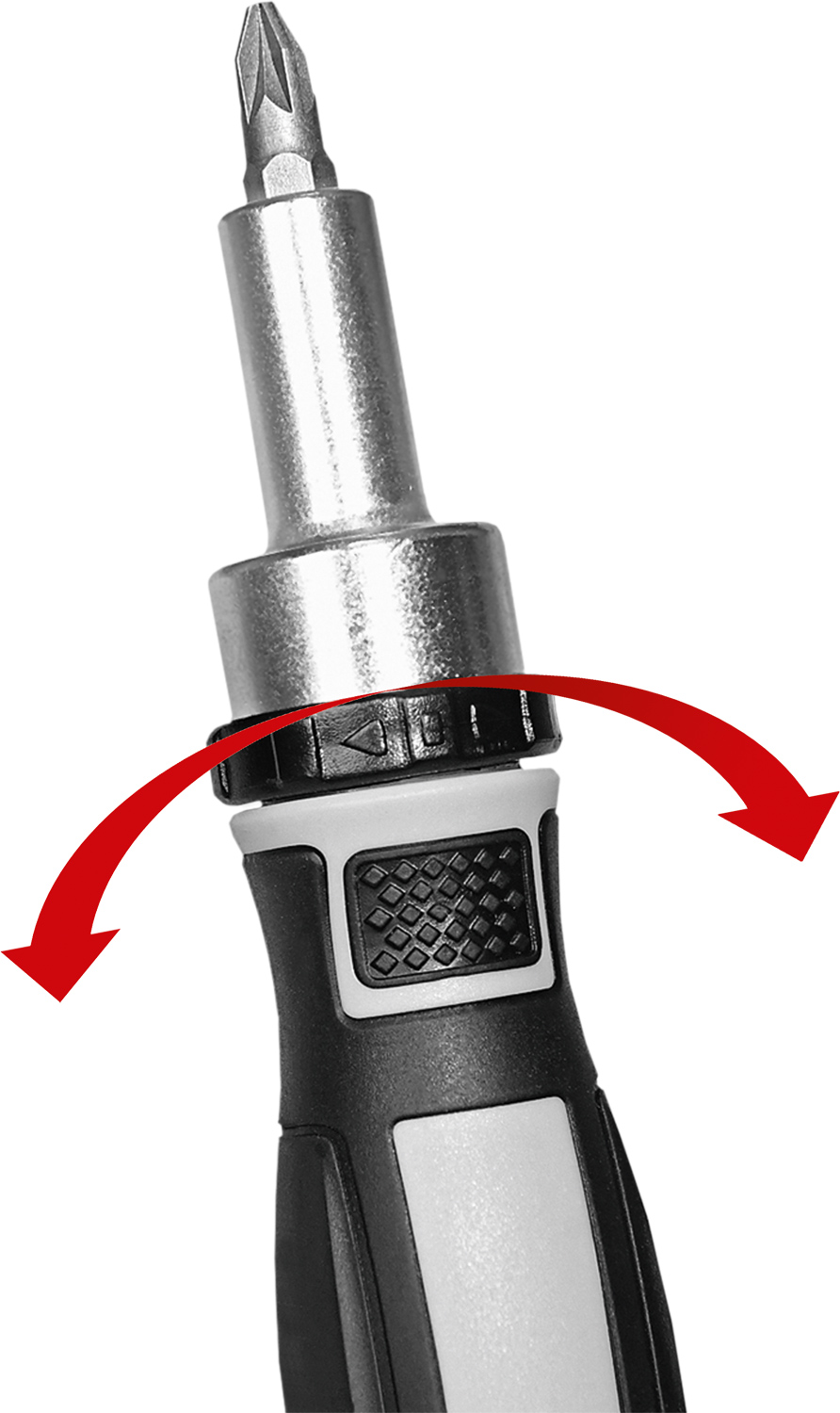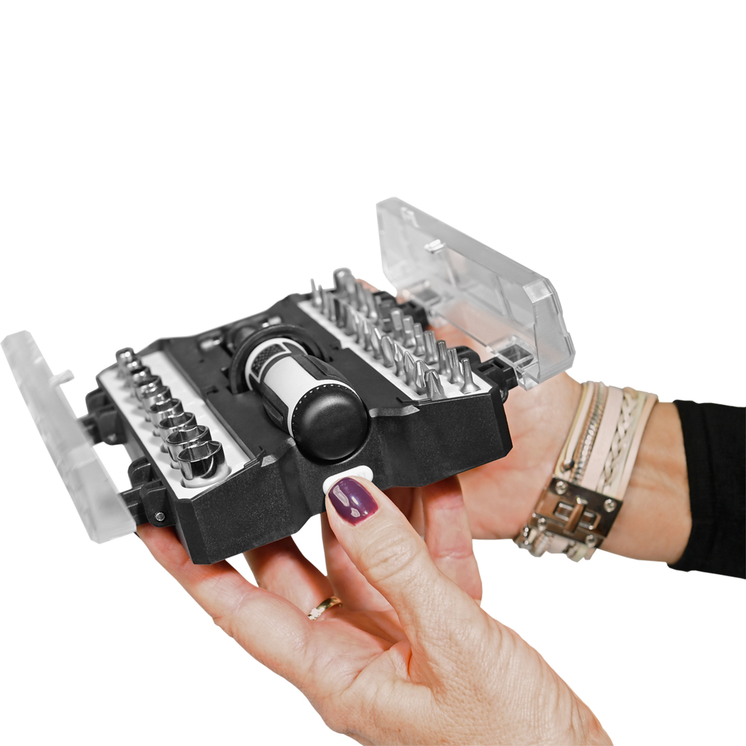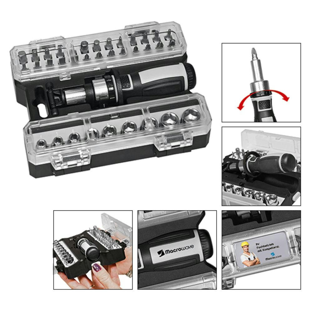 Set bestehend aus Bit-Schraubendreher mit magnetischer Bitaufnahme (1/4“) und Ratsche und insgesamt 25 Bits, 9 Stecknüssen und Adapter.