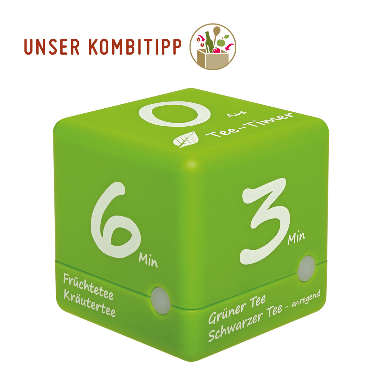 Angabe der Teesorten mit passenden Ablaufzeiten: 3 - 4 - 5 - 6 Min., gewünschte Zeit nach oben legen, Restzeitanzeige dreht sich mit, optisches & akustisches Signal nach Ablauf. Batterien nicht inklusive. Material: Kunststoff. Farbe: grün / weiß. Maße: 6 x 6 x 6 cm, Gewicht: 58 g