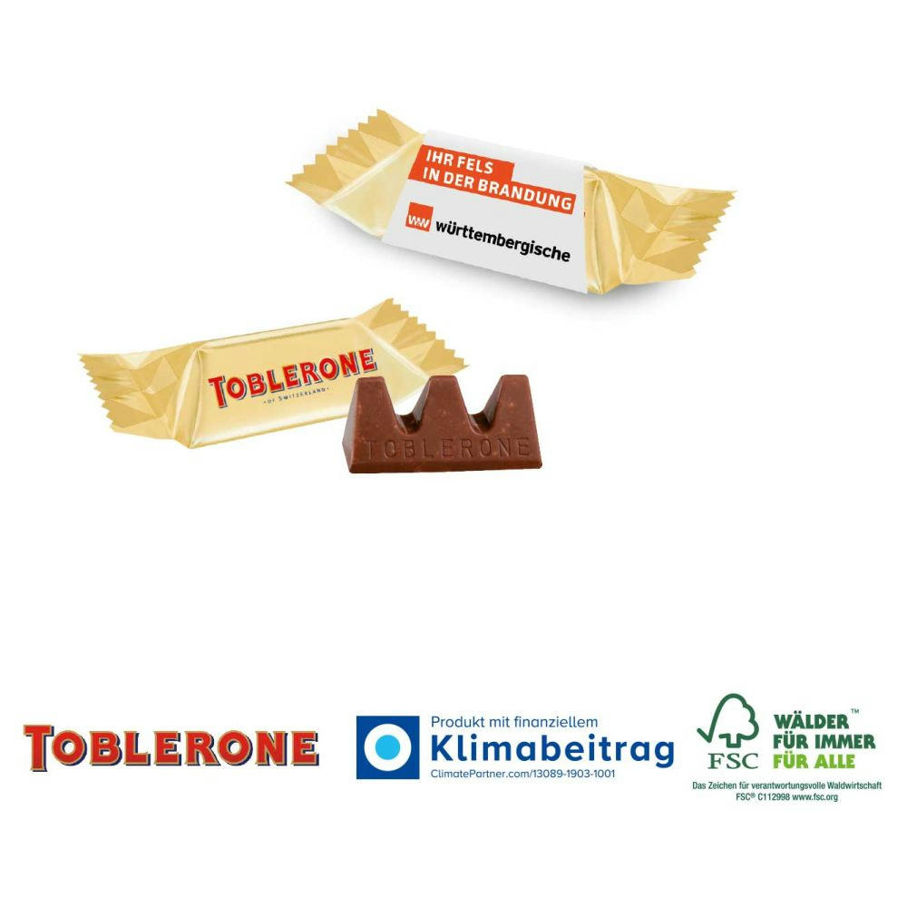 Kultschokolade mit Ihrer Werbung! TOBLERONE enthält nur ausgewählte Zutaten. Weltweit werden hier die besten Rohstoffe ausgesucht. Entdecken Sie Ihre Geschmackssinne neu und tauchen Sie ein in eine einzigartige Genusswelt. Ein ideales und hochwertiges Werbepräsent. Produktdetails: TOBLERONE Minis in Originalverpackung. Werbeschuber bzw. Werbeaufsteller individuell bedruckbar. Inhalt: 1 TOBLERONE Mini (ca. 8 g). Geschmacksrichtung: „Milch“