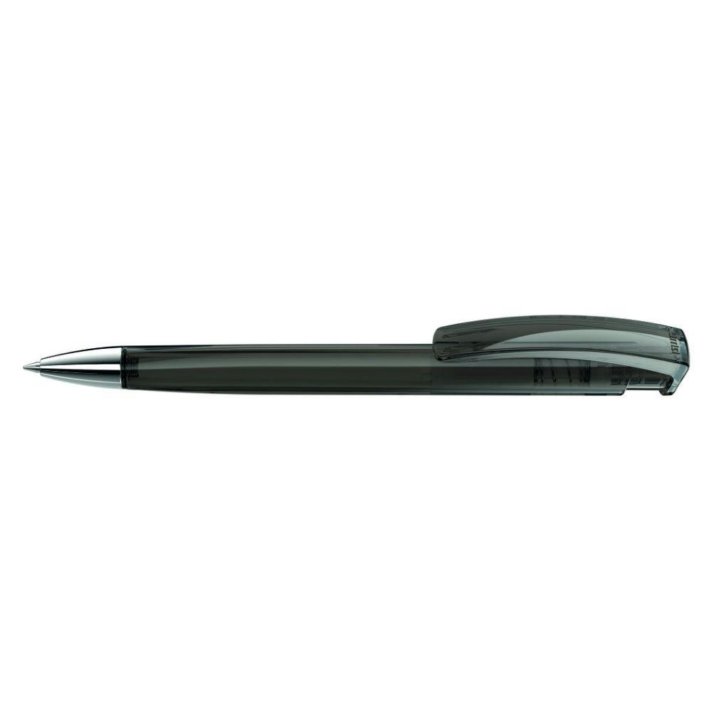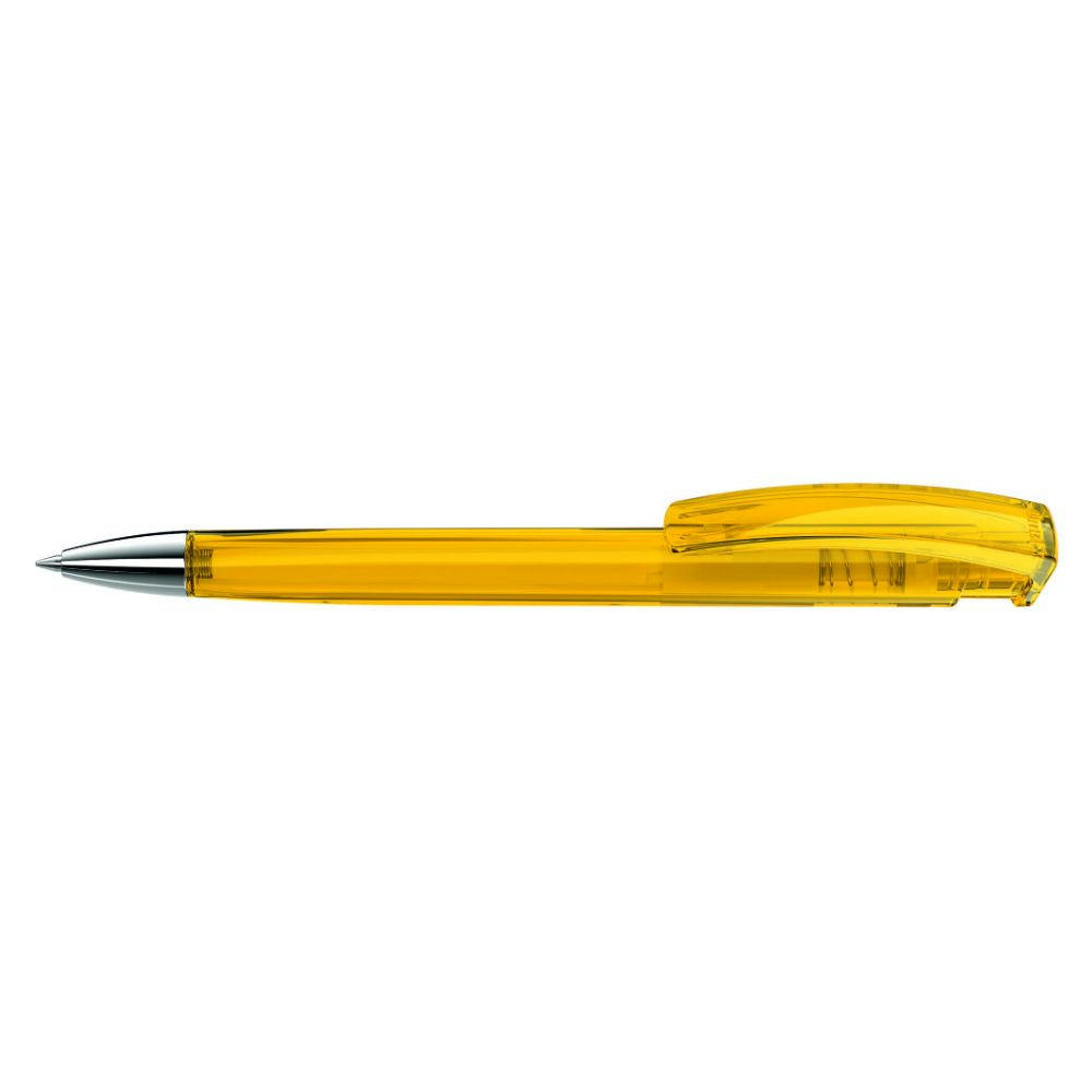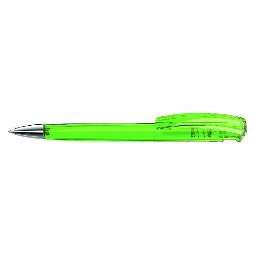 Druckkugelschreiber mit transparent glänzendem Dreikantgehäuse und schwerer Metallspitze glanzverchromt.