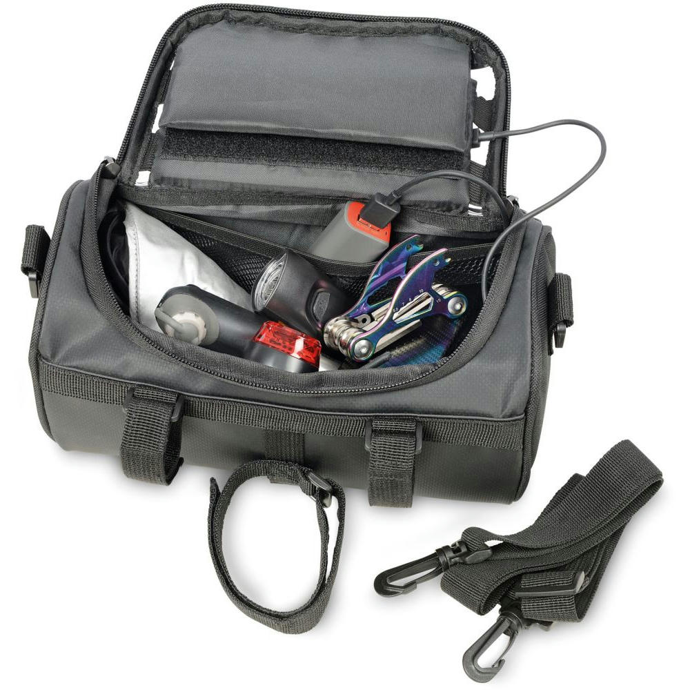 Fahrradtasche für den Lenker, flexible Befestigung mittels 3 Klettverschlussbändern am Lenker, geräumiges Hauptfach mit Reißverschluss, inkl. Netzfach (z.B.: für Powerbank), Touchscreen-Sichtfenster passend für gängige mobile Geräte zur Navigation, seitlich geöffnet zum Hauptfach (Laden via Powerbank), abnehmbarer, verstellbarer Schultergurt, Schlaufe zur Befestigung des Vorderlichts, Kapazität ca. 4 Liter, Tragkraft bis zu 5 kg, schützt Inhalt vor Spritzwasser (Wasserdichtheitsgrad IPX4) , formstabil durch verstärkte Kanten.