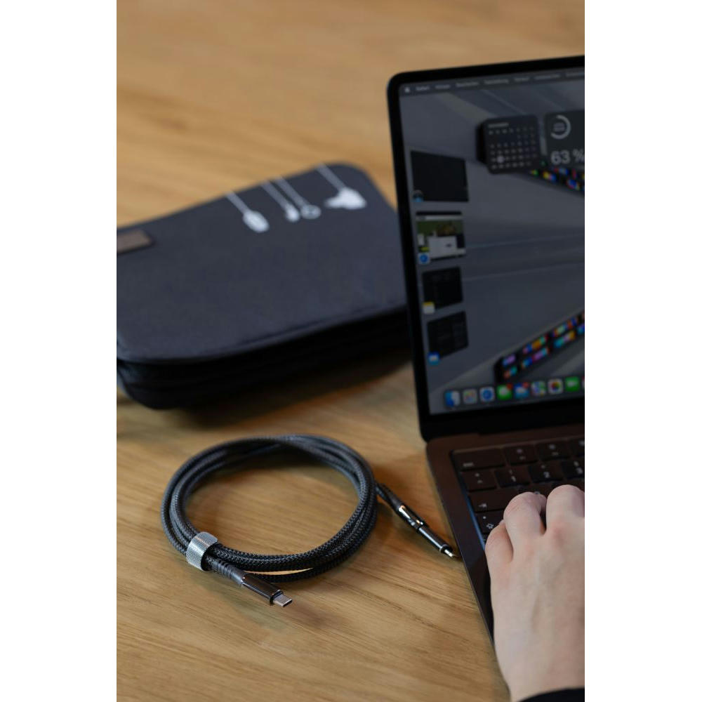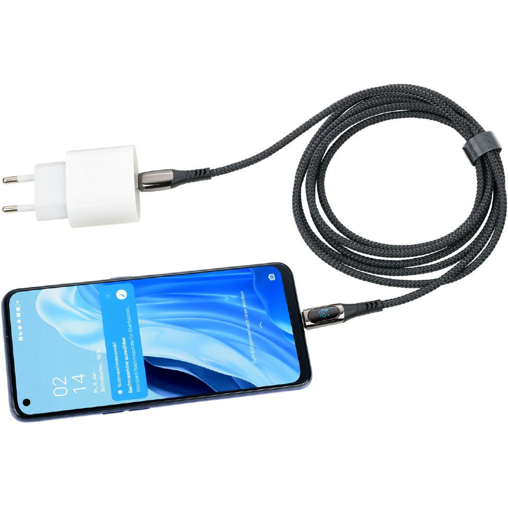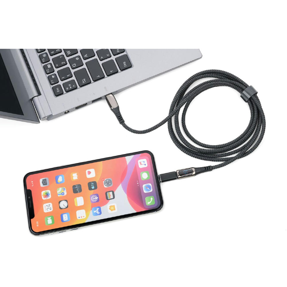 Ladekabel High-Speed USB-C 100W PD Power Delivery auf USB-C, mit Datenübertragungsfunktion, volle Ladekapazität: max. 100W|20V|5A (ohne Adapter), abhängig vom zu beladenen Gerät, mit digitaler Anzeige der Ladeleistung, inkl. USB-C auf Lightning Adapter, Kabel textilummantelt (Netzstruktur), recyceltes Polyester, 2m Länge, Metall, Polyester, gunmetal/schwarz