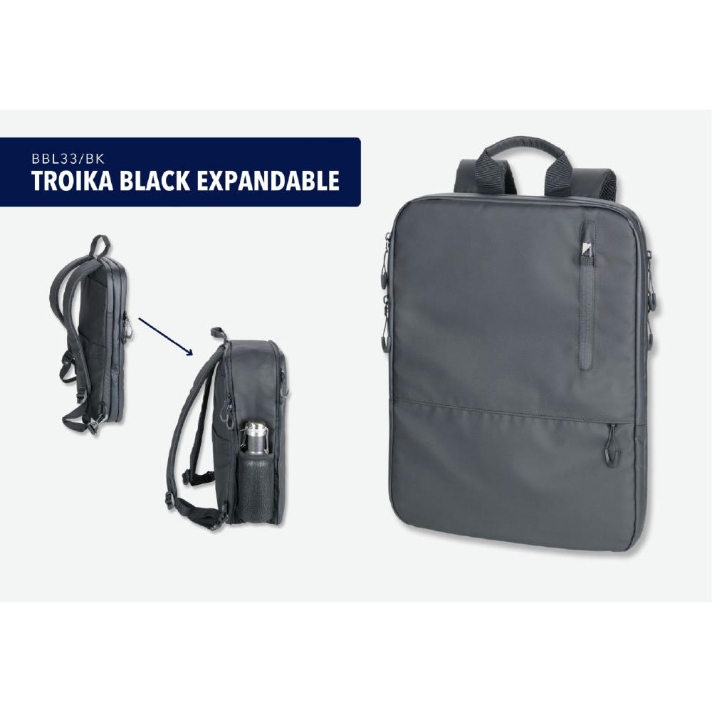 Bringt Ordnung in Ihre digitale Arbeits-und Freizeitwelt. Laptopfach bis zu 16". Durch zusätzlichen Reißverschluss erweiterbar von 6 auf 14 Liter. Fronttasche mit Diebstahlschutz und Karabiner. Verstärkter Standboden, Schlaufe zur Befestigung am Trolley, Tragegriff, versteckte Rucksackgurte.